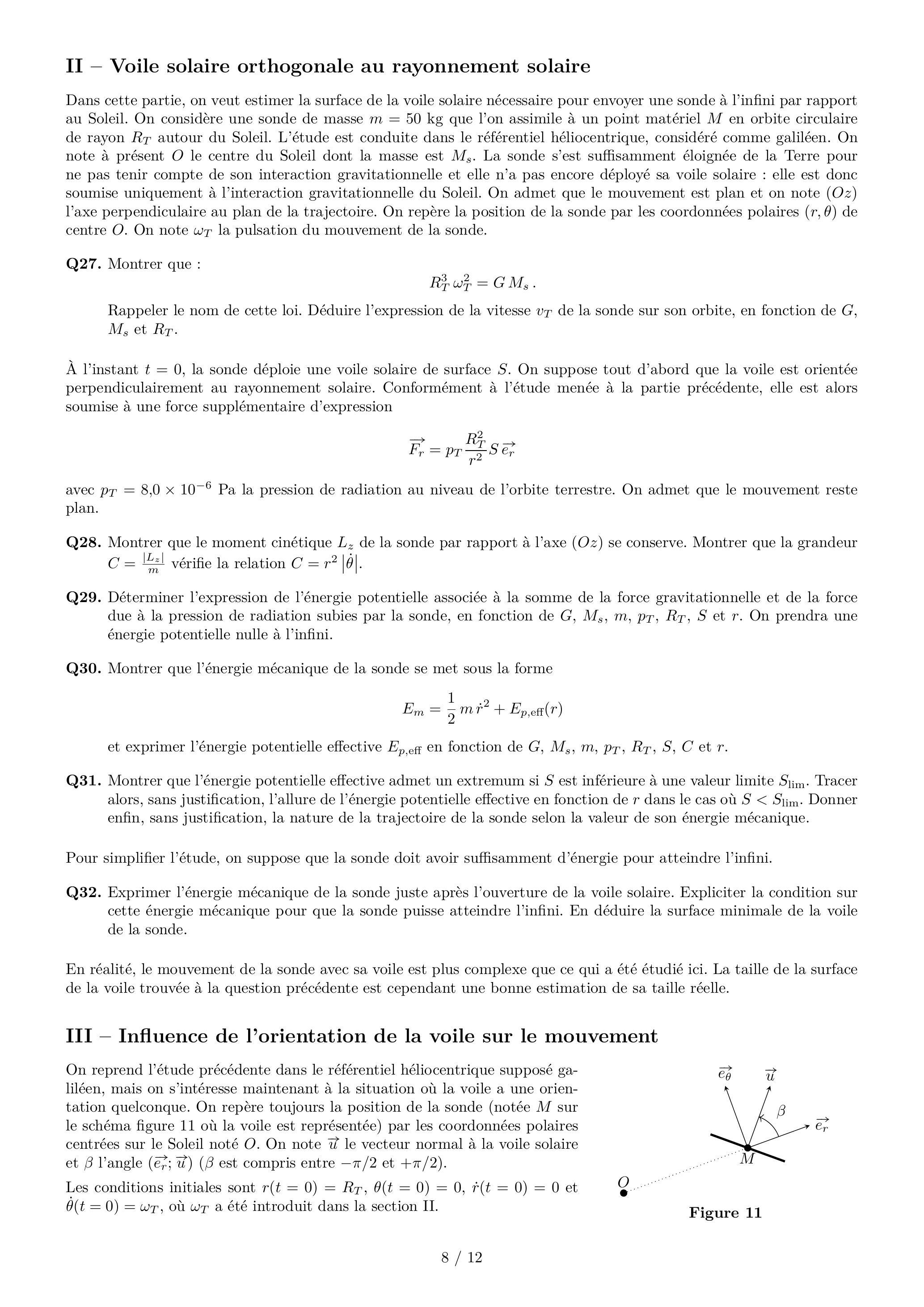Q32. Exprimer l'énergie mécanique de la sonde juste après l'ouverture de la voile solaire. Expliciter la condition sur cette énergie mécanique pour que la sonde puisse atteindre l'infini. En déduire la surface minimale de la voile de la sonde.
