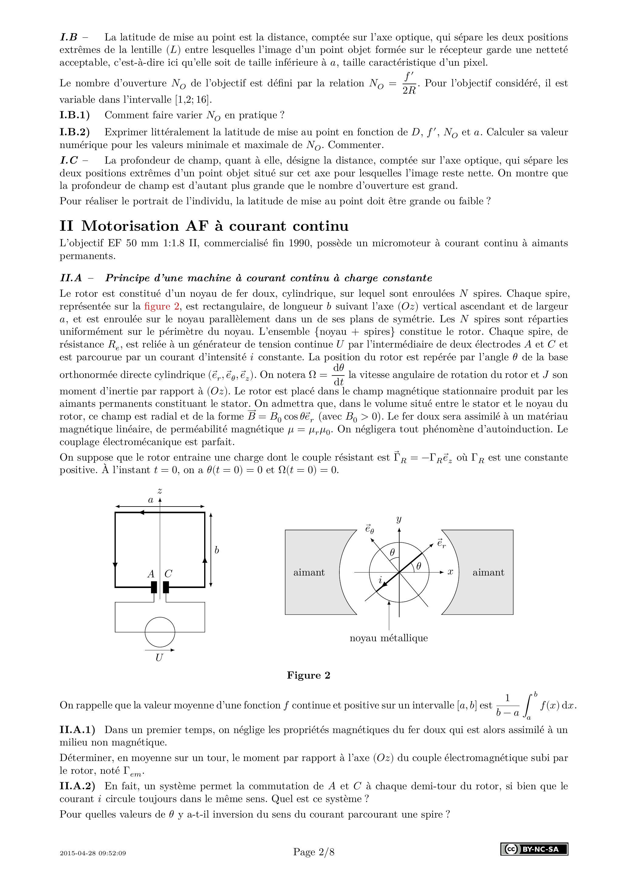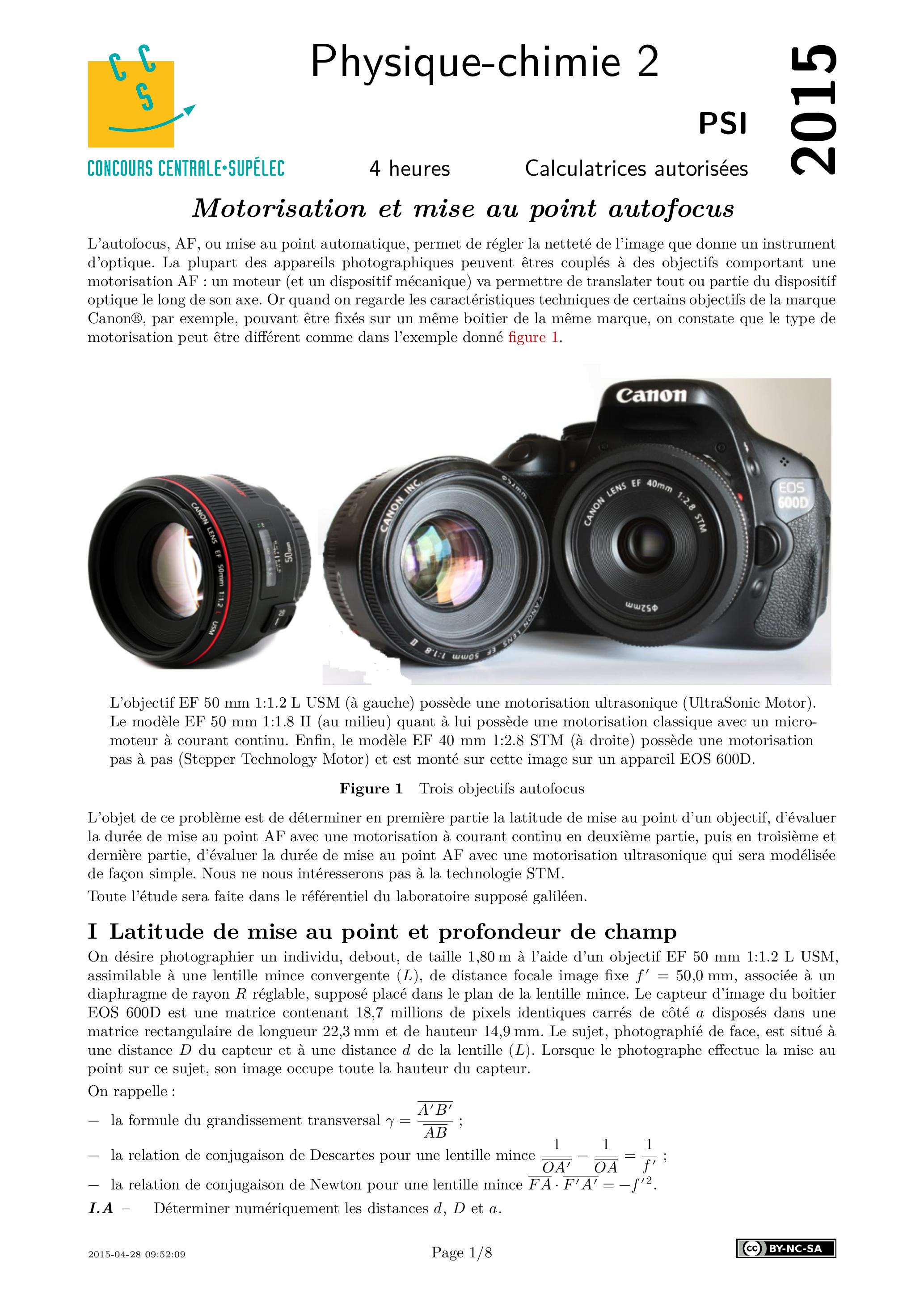 L'objet de ce problème est de déterminer en première partie la latitude de mise au point d'un objectif, d'évaluer la durée de mise au point AF avec une motorisation à courant continu en deuxième partie, puis en troisième et dernière partie, d'évaluer la durée de mise au point AF avec une motorisation ultrasonique qui sera modélisée de façon simple. Nous ne nous intéresserons pas à la technologie STM.