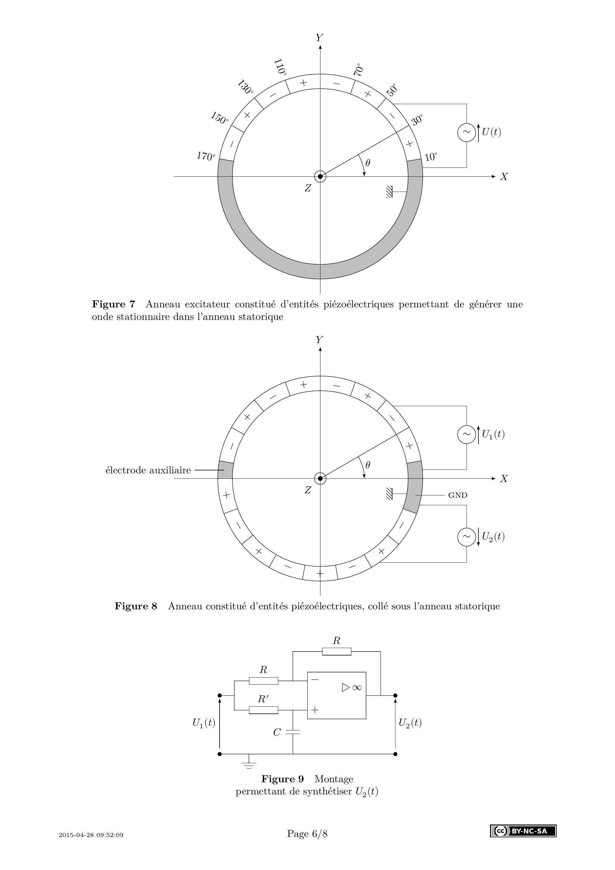 b) On utilise un anneau piézoélectrique constitué et excité comme l'indique la figure 8 : la tension excite une première succession de 4 motifs identiques à ceux représentés en figure 6, alors que la tension , synthétisée à l'aide du montage représenté en figure 9 , excite une autre succession de 4 motifs identiques.