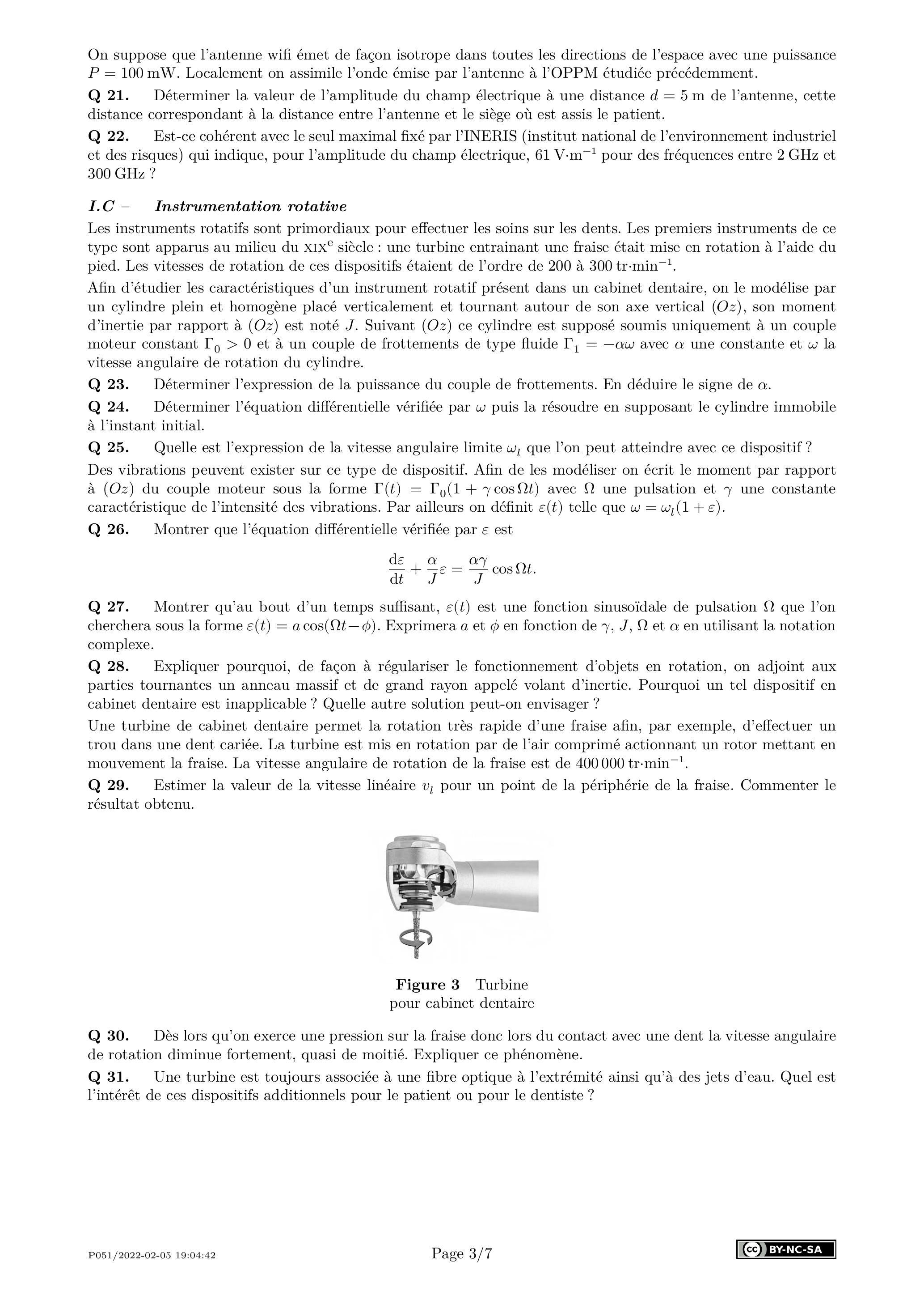 Ce sujet, on étudie quelques liens entre la physique-chimie et le domaine de la santé. Le sujet comporte deux parties indépendantes: une sur les différents dispositifs utilisés dans un cabinet dentaire et l'autre sur les fonctionnalités du cœur. Dans chacune de ces parties de nombreuses questions sont indépendantes.