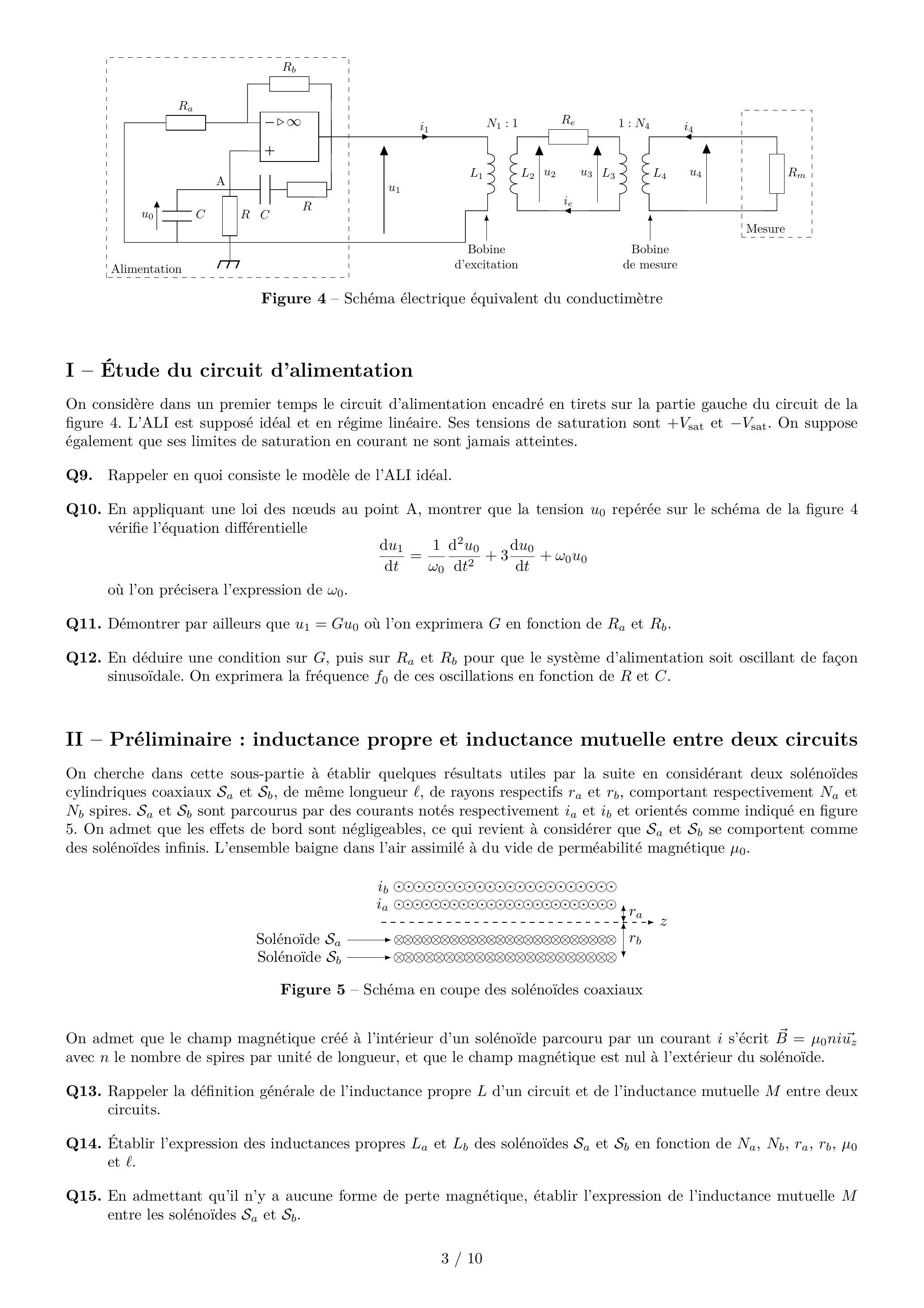 Les flotteurs Argo sont ainsi équipés de conductimètres inductifs, dont le principe est schématisé en figure 3. Ce capteur est composé de deux bobines toroïdales placées côte à côte. La première bobine, appelée bobine d'excitation, est alimentée par une tension sinusoïdale . Sa résistance interne est négligeable et son inductance propre est . Elle se comporte comme le primaire d'un transformateur dont le circuit secondaire est l'eau qui baigne l'ensemble et que l'on peut assimiler à une boucle conductrice de résistance , proportionnelle à l'inverse de la conductivité de l'eau. Cette boucle se comporte à son tour comme le circuit primaire d'un transformateur dont le secondaire est la seconde bobine, appelée bobine de mesure, de résistance interne négligeable et d'inductance propre . D'un point de vue électrique, l'ensemble est donc modélisable par le circuit représenté en figure 4 , où figurent également le circuit d'alimentation et celui, modélisé par une résistance ,