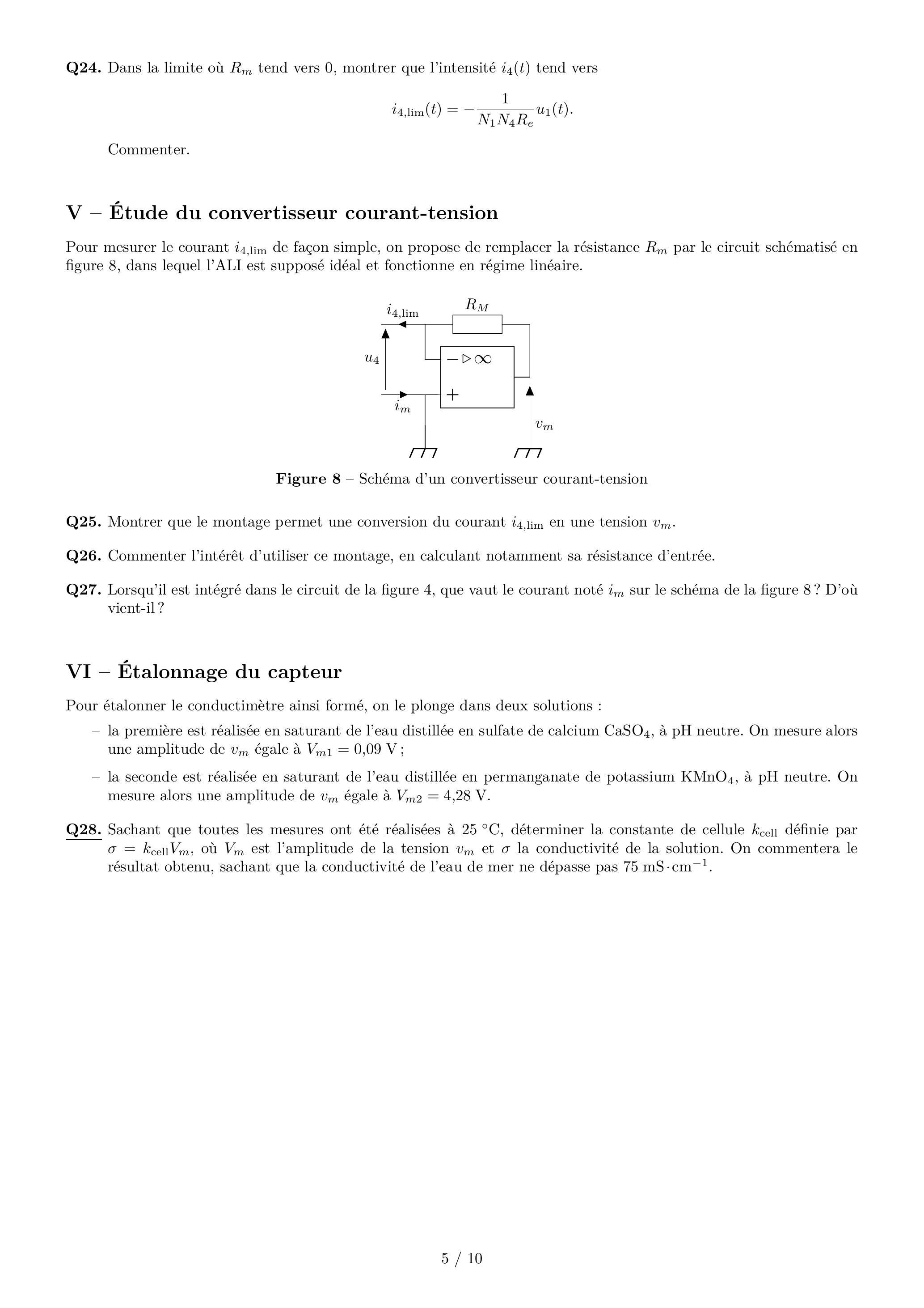 Q28. Sachant que toutes les mesures ont été réalisées à , déterminer la constante de cellule définie par , où est l'amplitude de la tension et la conductivité de la solution. On commentera le résultat obtenu, sachant que la conductivité de l'eau de mer ne dépasse pas .