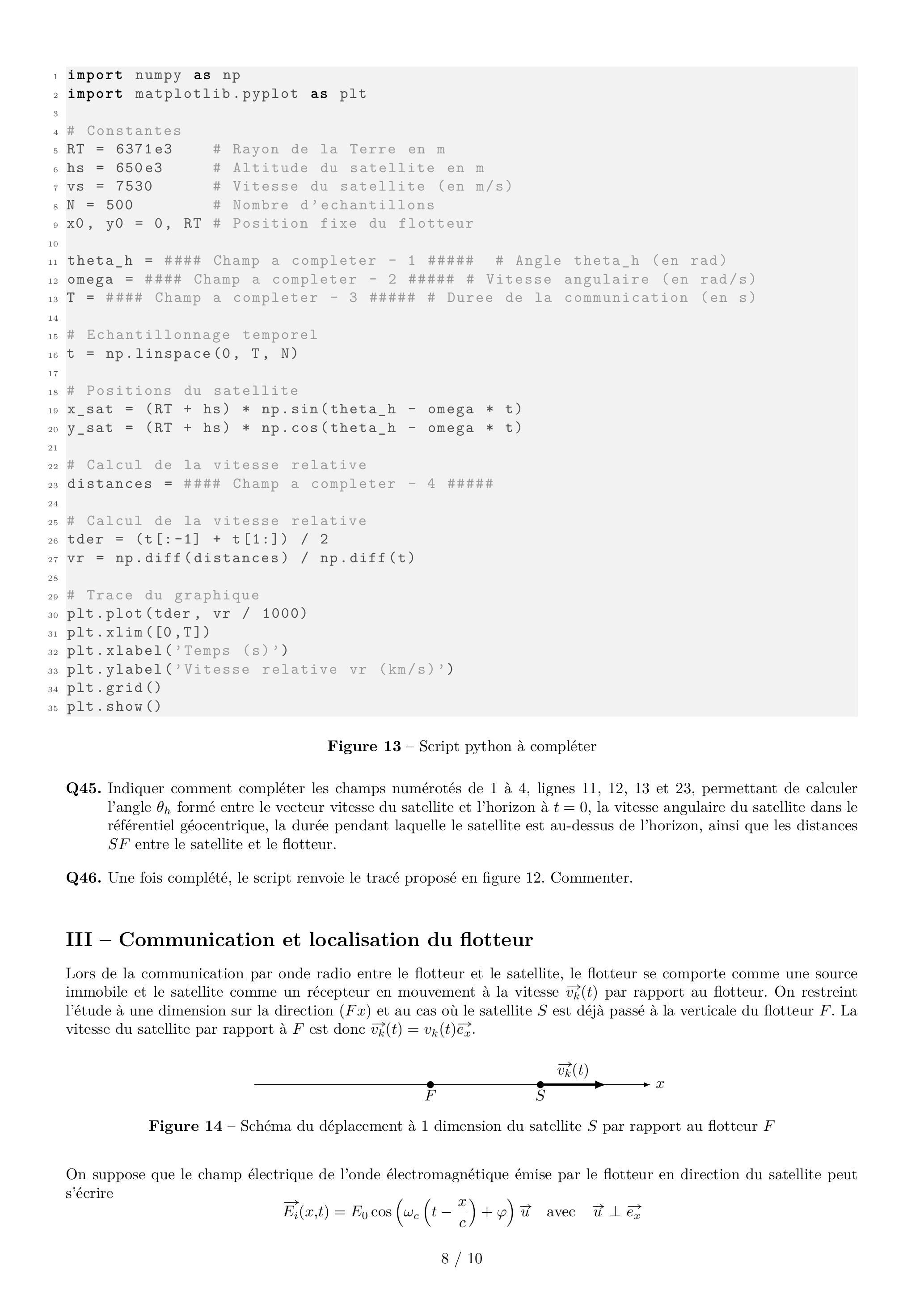 Le flotteur ne peut communiquer avec le satellite que lorsque celui-ci est au-dessus de sa ligne d'horizon, représentée en pointillés sur la figure 11. Le script python fourni en figure 13 permet le calcul de la vitesse radiale relative du satellite par rapport au flotteur, en choisissant comme référence du temps l'instant où le satellite apparaît sur l'horizon.