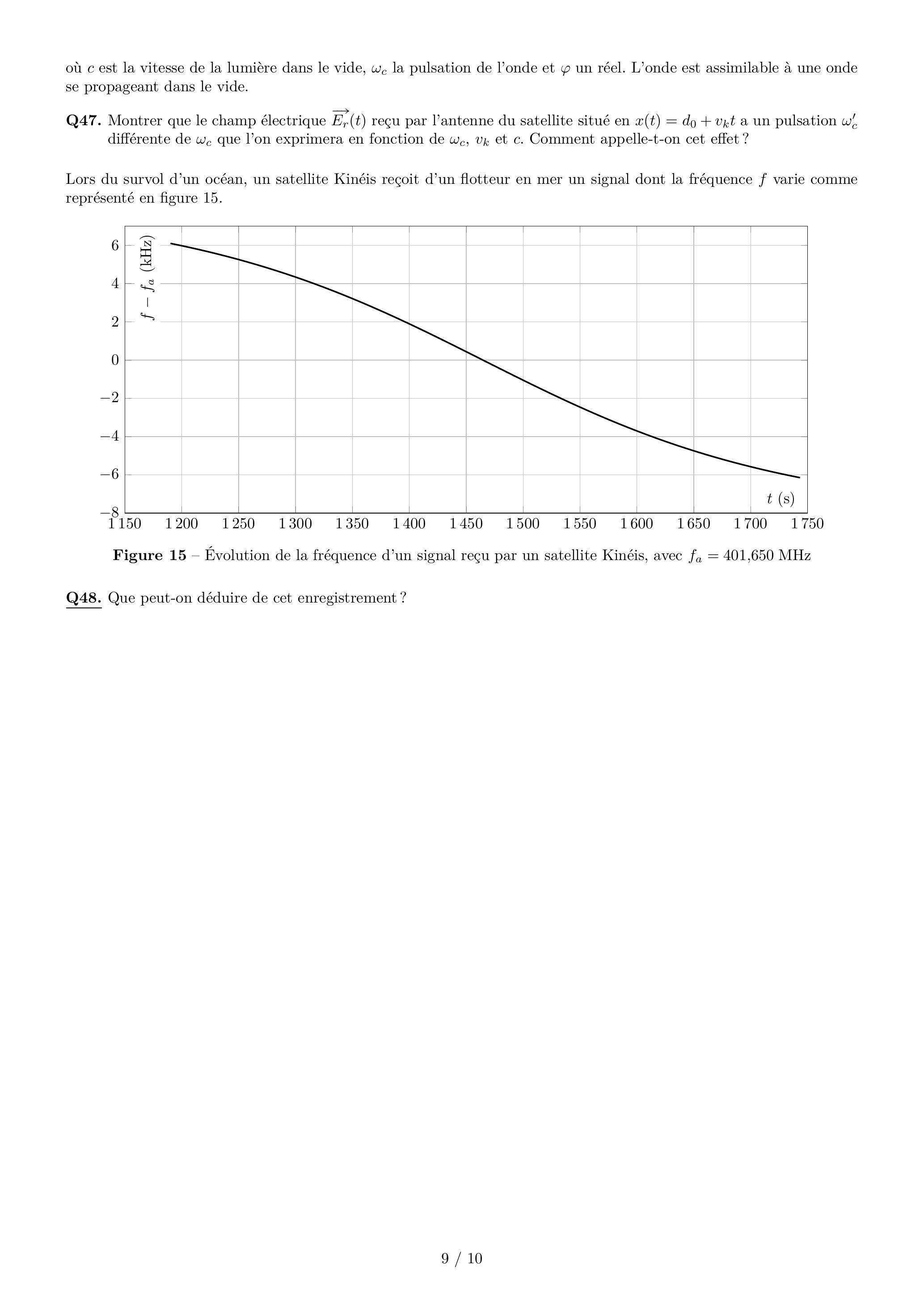 Lors du survol d'un océan, un satellite Kinéis reçoit d'un flotteur en mer un signal dont la fréquence varie comme représenté en figure 15.