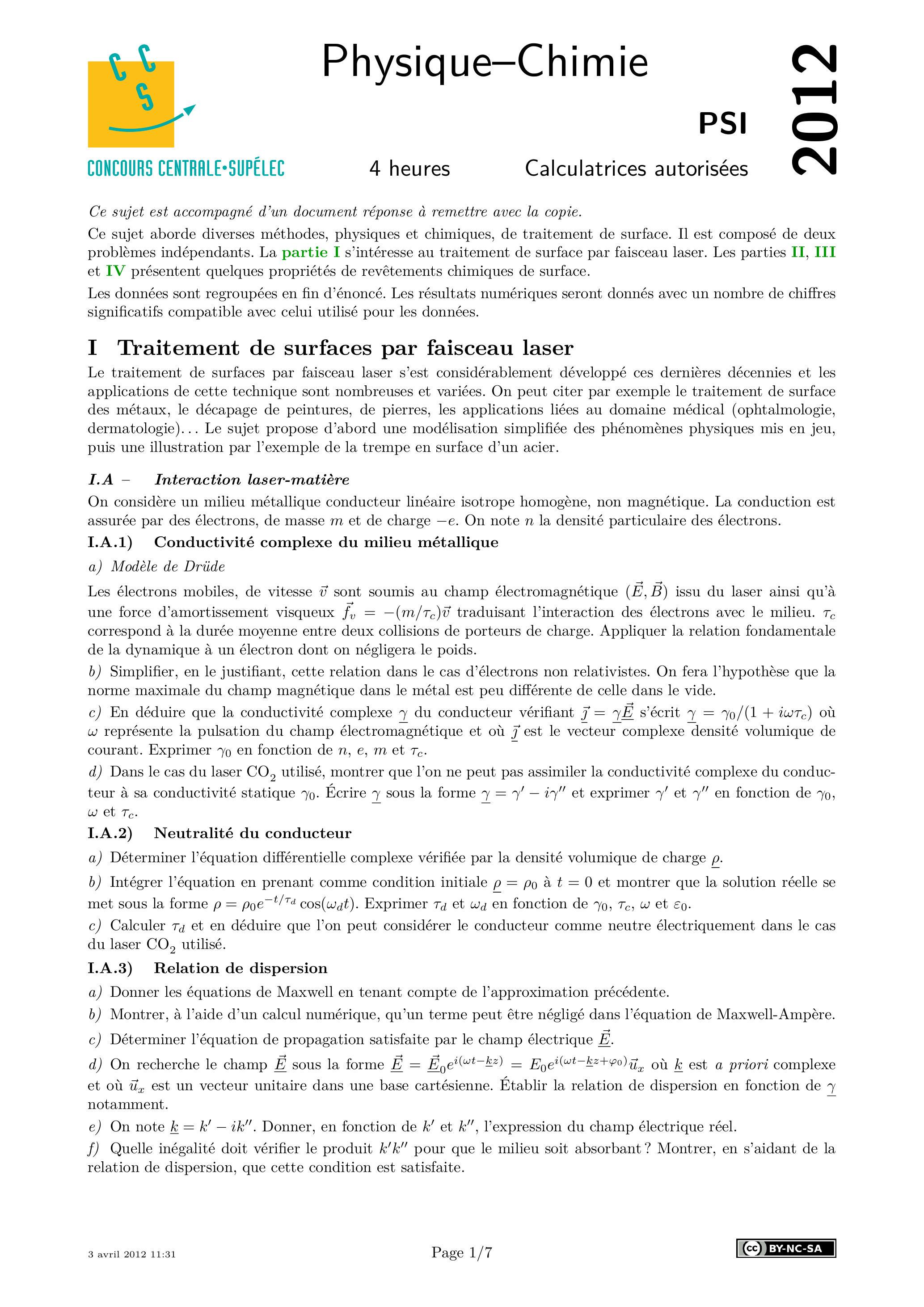 Centrale Physique Chimie PSI 2012 - Version Web LaTeX | WikiPrépa | WikiPrépa