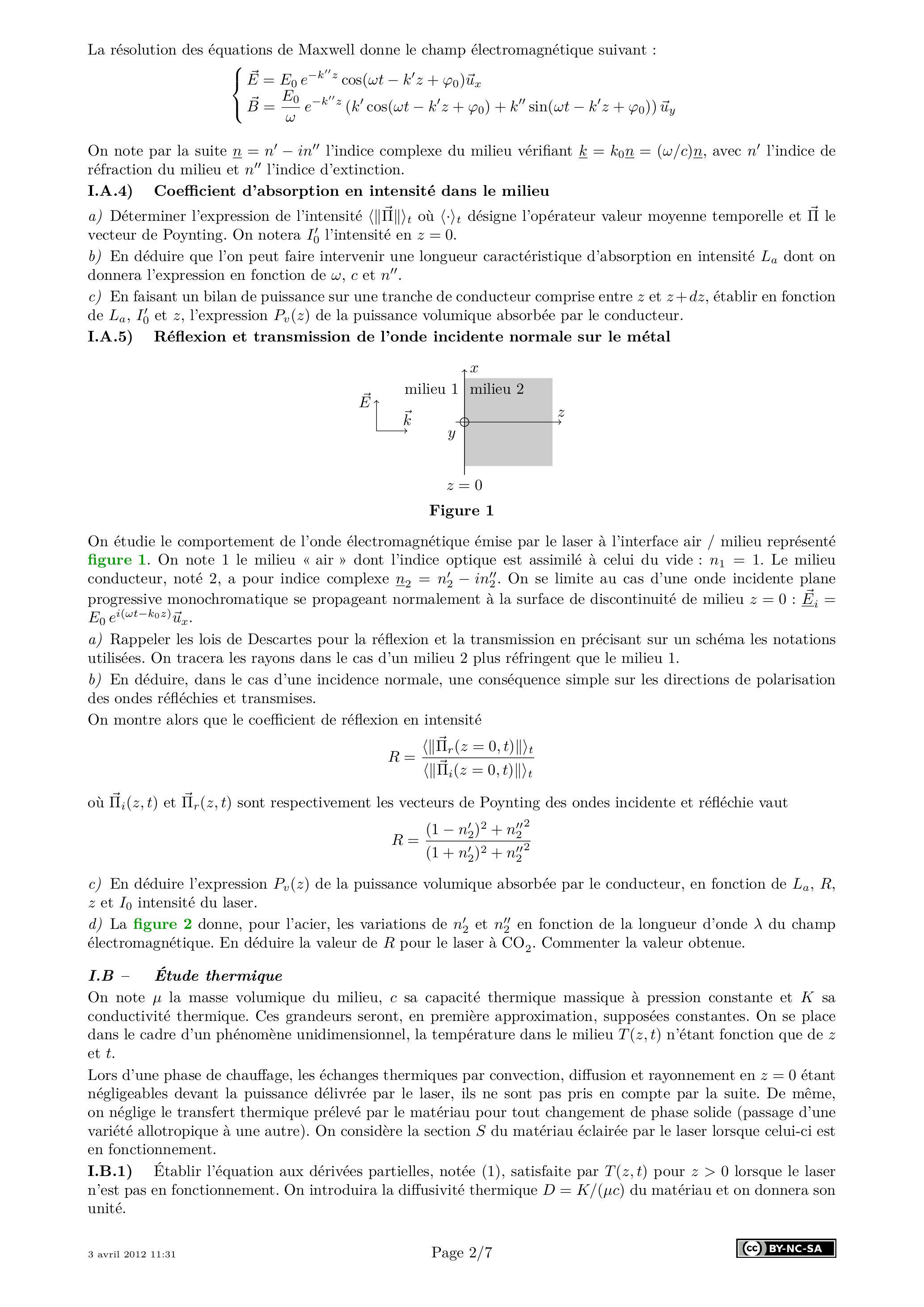 On étudie le comportement de l'onde électromagnétique émise par le laser à l'interface air / milieu représenté figure 1. On note 1 le milieu «air» dont l'indice optique est assimilé à celui du vide : . Le milieu conducteur, noté 2 , a pour indice complexe . On se limite au cas d'une onde incidente plane progressive monochromatique se propageant normalement à la surface de discontinuité de milieu .