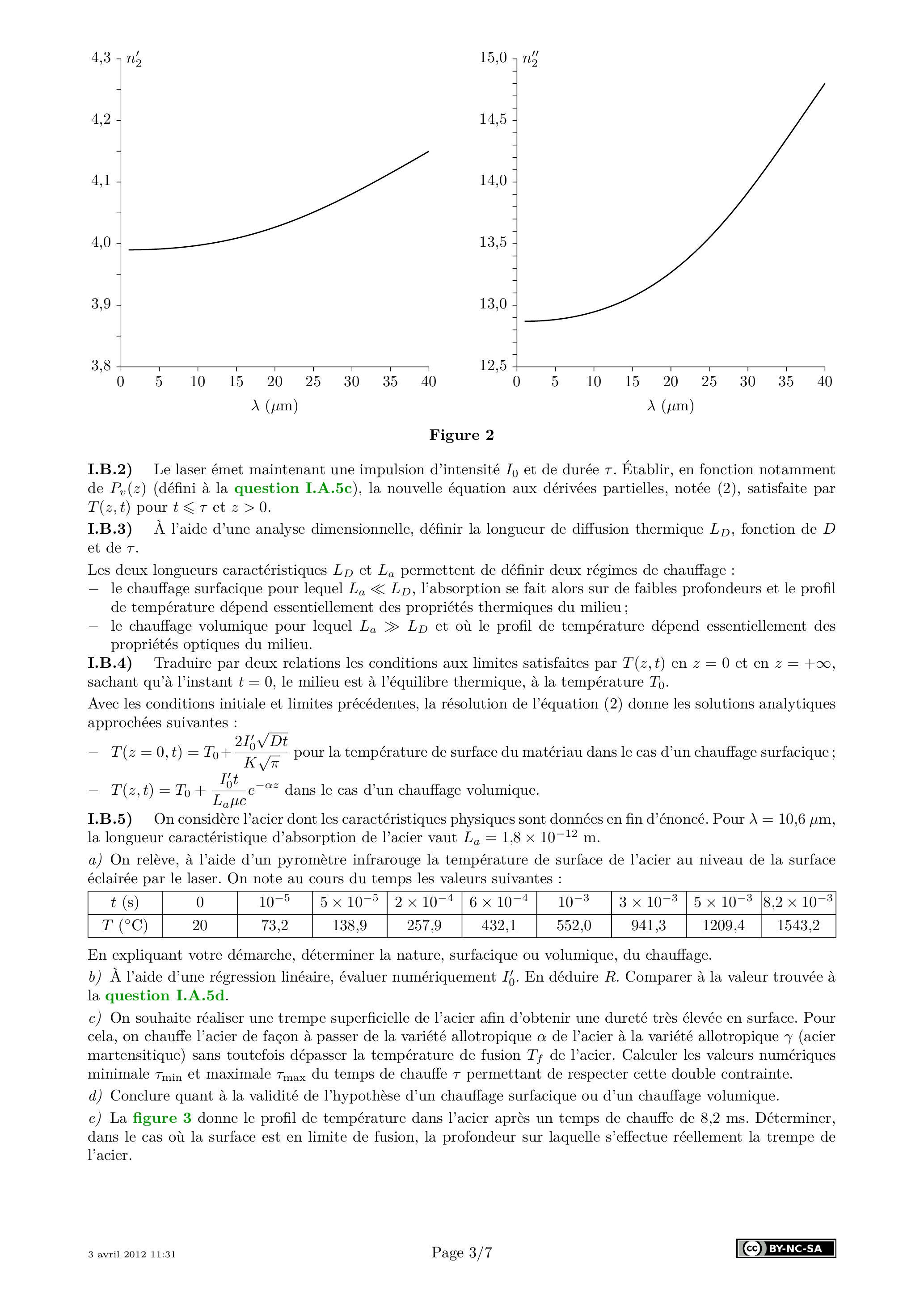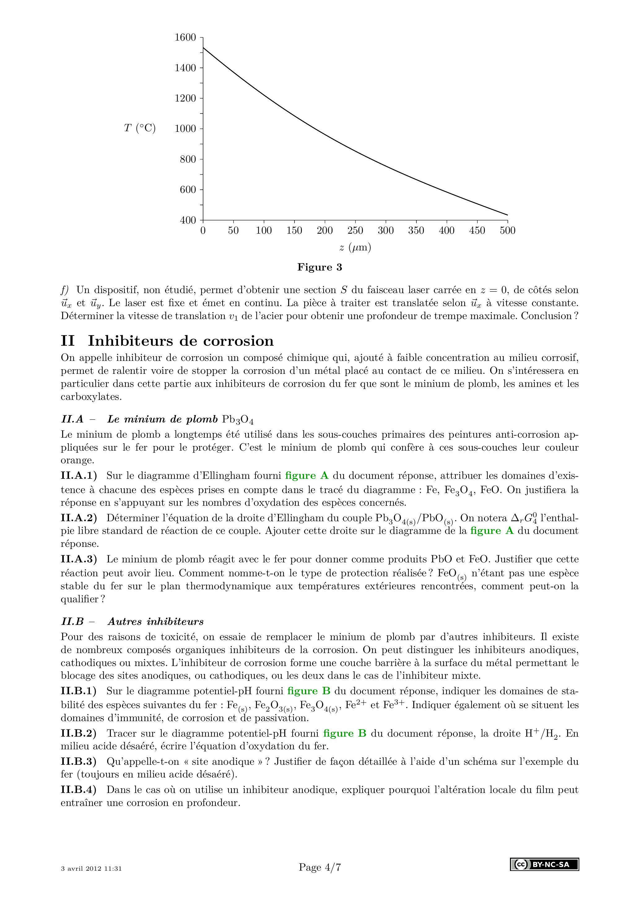 e) La figure 3 donne le profil de température dans l'acier après un temps de chauffe de . Déterminer, dans le cas où la surface est en limite de fusion, la profondeur sur laquelle s'effectue réellement la trempe de l'acier.