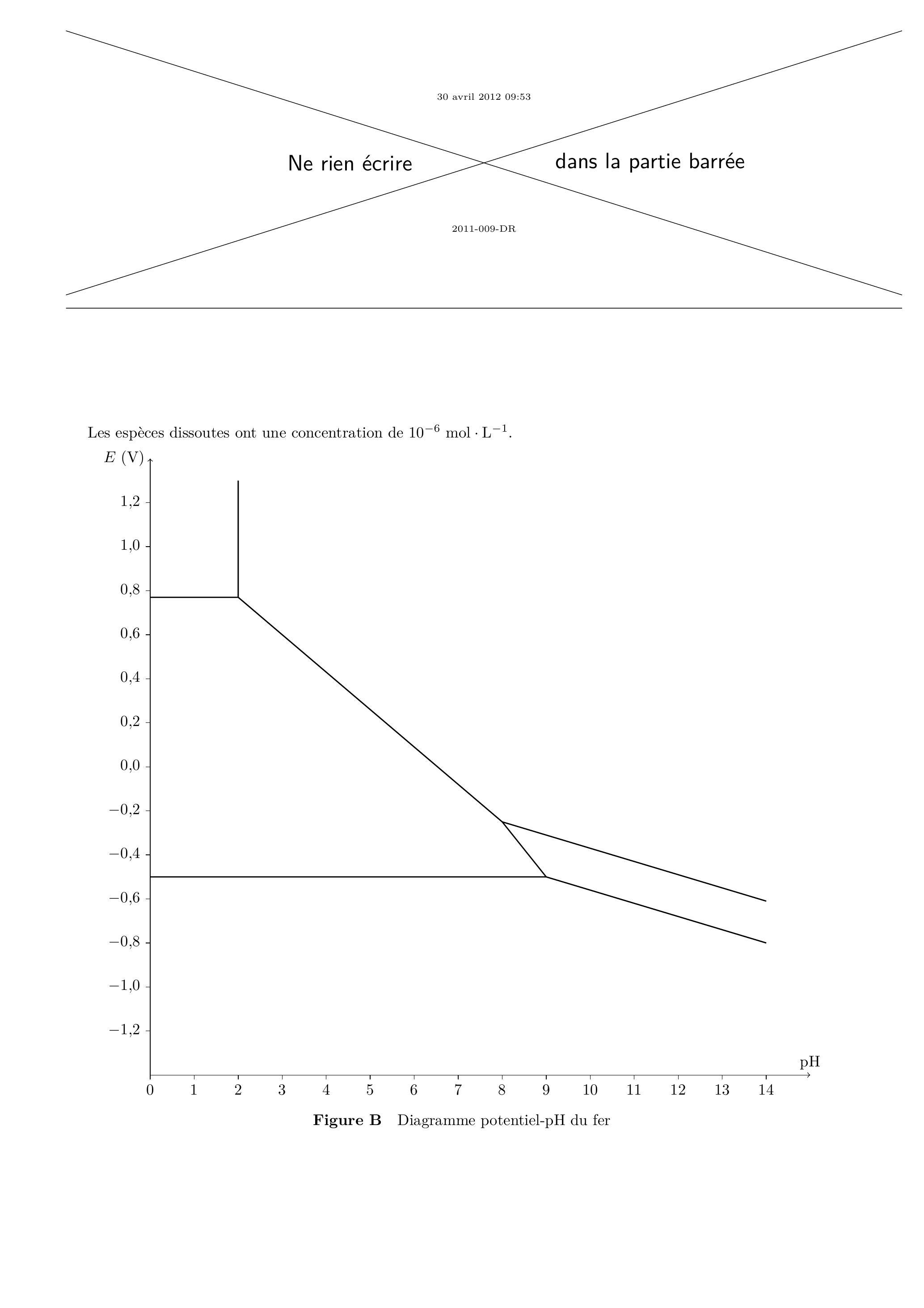 II.B.1) Sur le diagramme potentiel- pH fourni figure du document réponse, indiquer les domaines de stabilité des espèces suivantes du fer : et . Indiquer également où se situent les domaines d'immunité, de corrosion et de passivation.