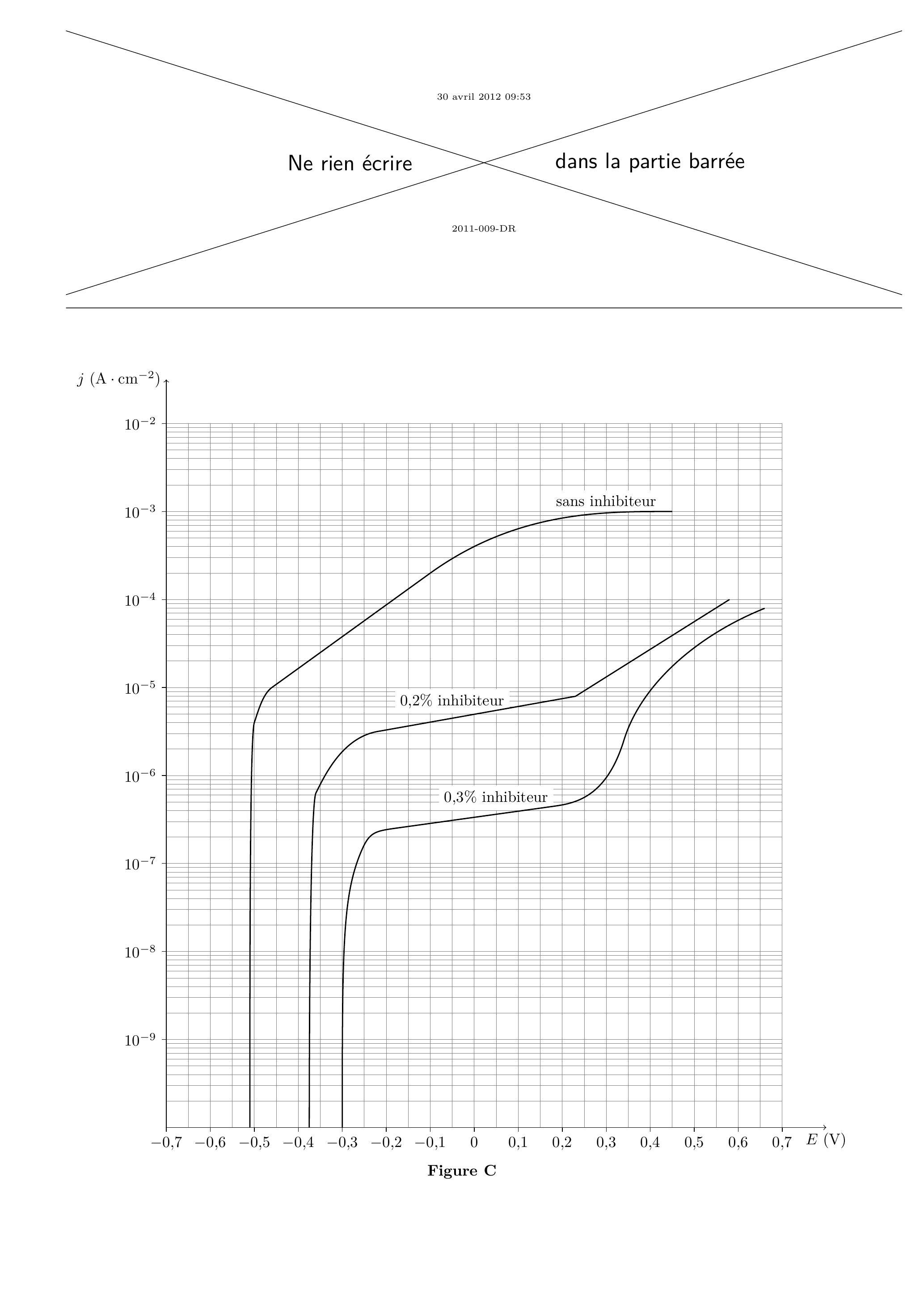 On met en œuvre un montage à trois électrodes : une électrode de travail (qui est recouverte d'une couche d'acier dont on étudie la corrosion), une électrode de référence et une contre-électrode. On trace (cf figure du document réponse) les courbes intensité-potentiel relatives à l'électrode de travail pour différentes concentrations d'inhibiteur (le potentiel en abscisse étant fourni par rapport à l'électrode au calomel saturée ou ECS, qui sert de référence). L'échelle verticale est logarithmique.