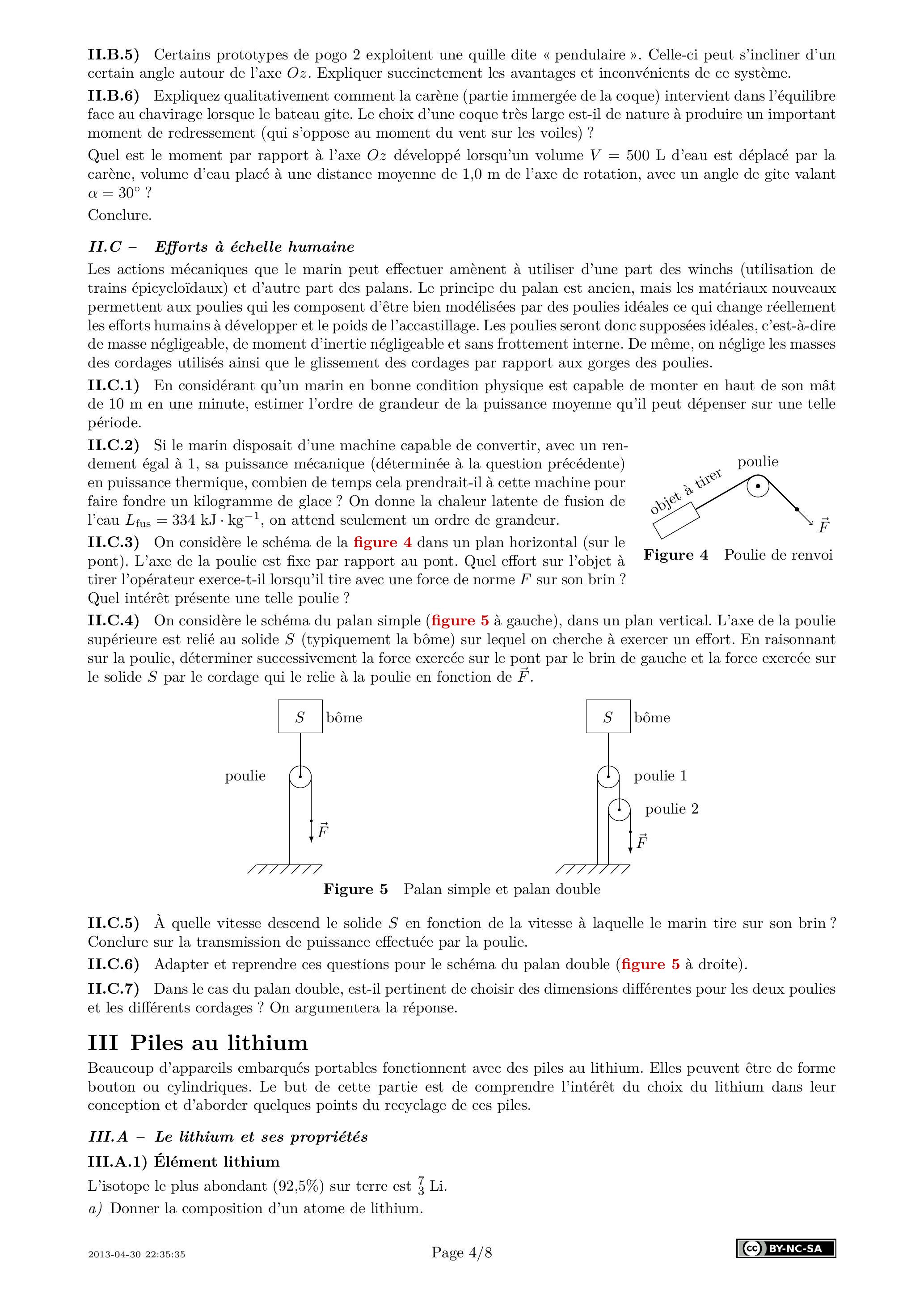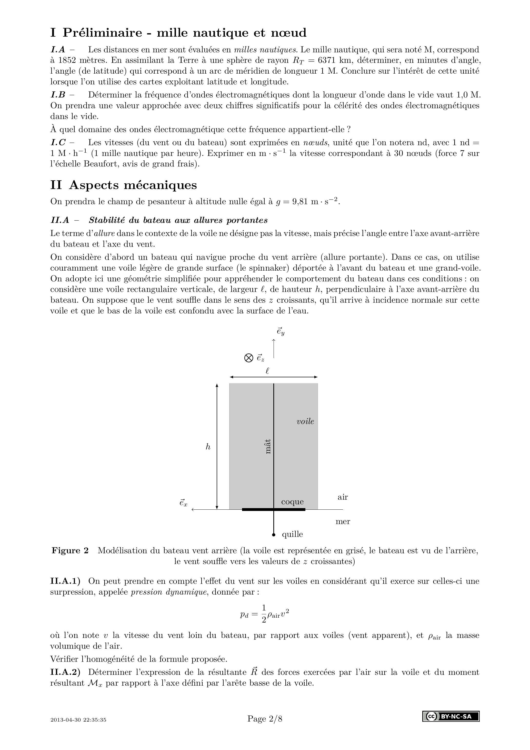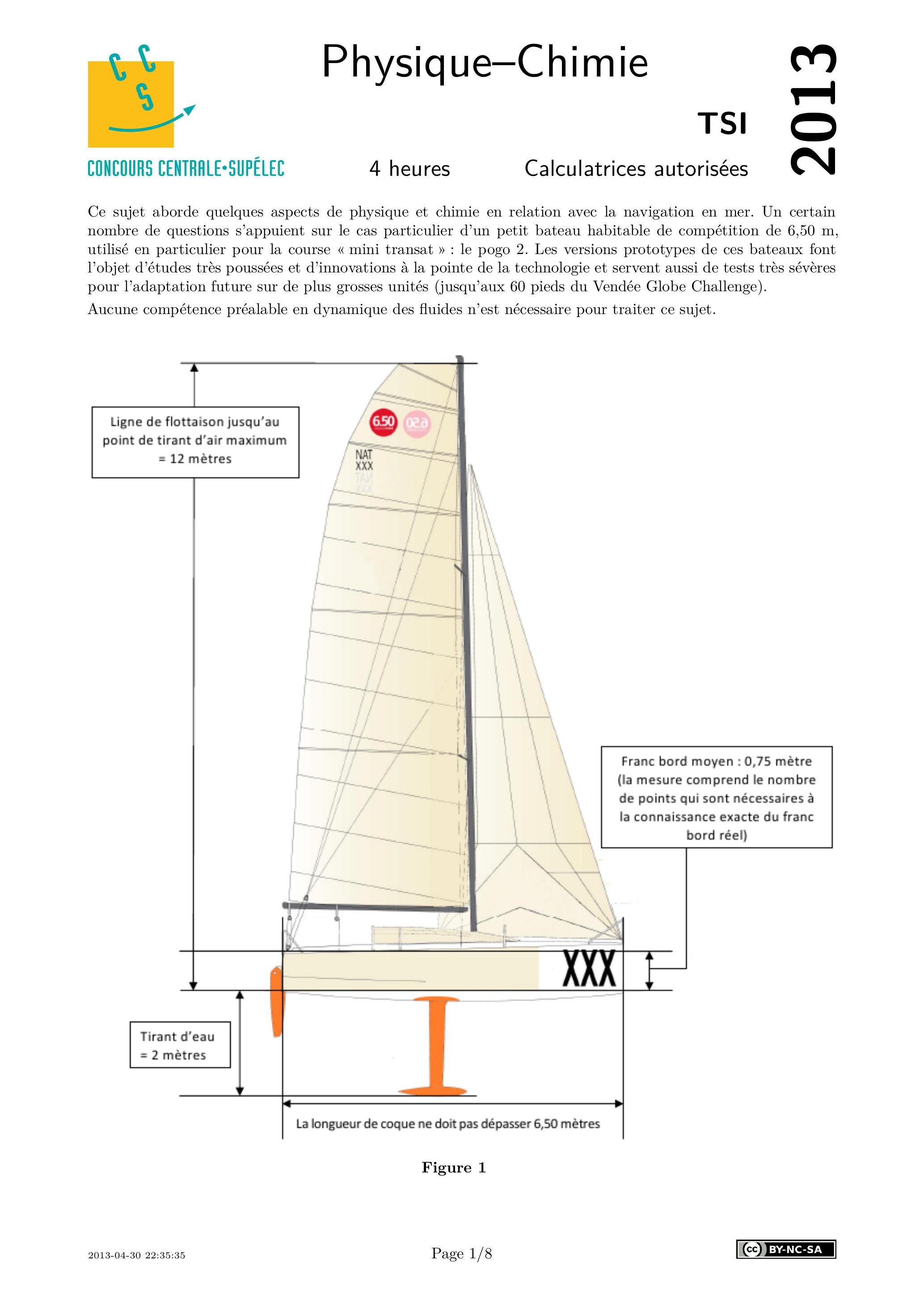 Ce sujet aborde quelques aspects de physique et chimie en relation avec la navigation en mer. Un certain nombre de questions s'appuient sur le cas particulier d'un petit bateau habitable de compétition de , utilisé en particulier pour la course «mini transat »: le pogo 2. Les versions prototypes de ces bateaux font l'objet d'études très poussées et d'innovations à la pointe de la technologie et servent aussi de tests très sévères pour l'adaptation future sur de plus grosses unités (jusqu'aux 60 pieds du Vendée Globe Challenge).