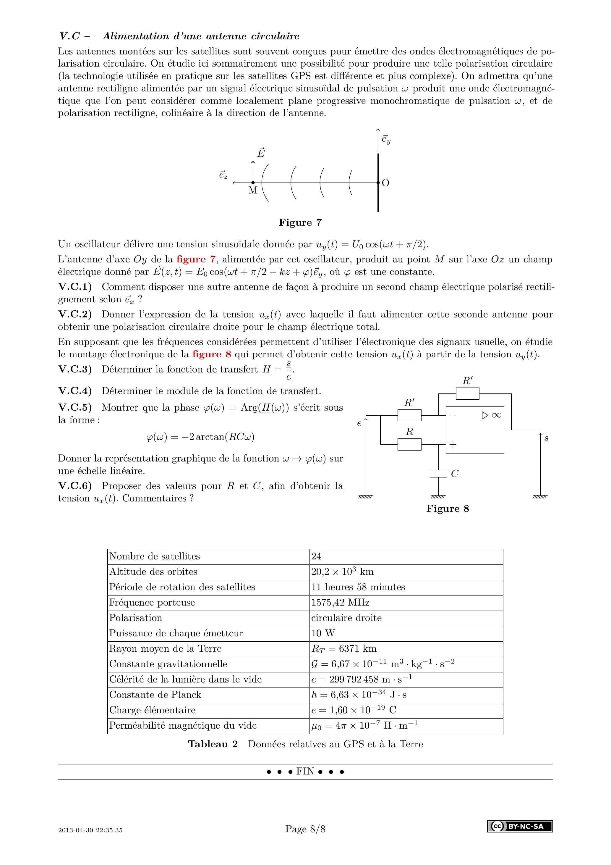 Le positionnement en mer s'effectue couramment en exploitant un récepteur GPS. Le système GPS repose sur une flotte de 24 satellites placés sur un ensemble d'orbites circulaires, qui présentent toutes une même inclinaison par rapport au plan équatorial. Chaque satellite émet en continu des signaux à travers une porteuse à . Un récepteur (appelé parfois «un GPS») peut calculer sa position, sa vitesse et l'heure à partir des signaux reçus par au moins 4 émetteurs différents. Le tableau 2 en fin d'énoncé rassemble quelques données relatives au système GPS et à la Terre, ainsi que les valeurs numériques de quelques constantes.