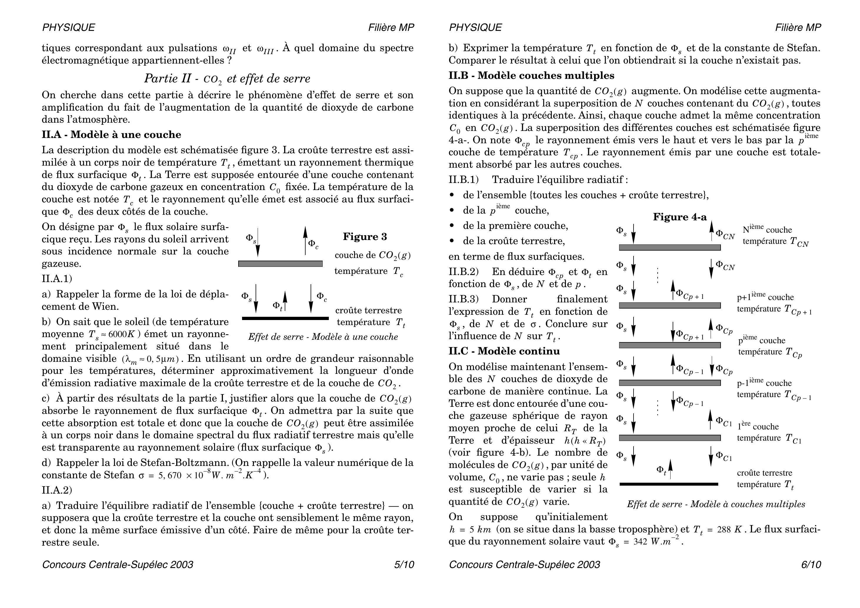 a) Traduire l'équilibre radiatif de l'ensemble {couche + croûte terrestre} - on supposera que la croûte terrestre et la couche ont sensiblement le même rayon, et donc la même surface émissive d'un côté. Faire de même pour la croûte terrestre seule. milée à un corps noir de température , émettant un rayonnement thermique de flux surfacique . La Terre est supposée entourée d'une couche contenant du dioxyde de carbone gazeux en concentration fixée. La température de la couche est notée et le rayonnement qu'elle émet est associé au flux surfacique des deux côtés de la couche.