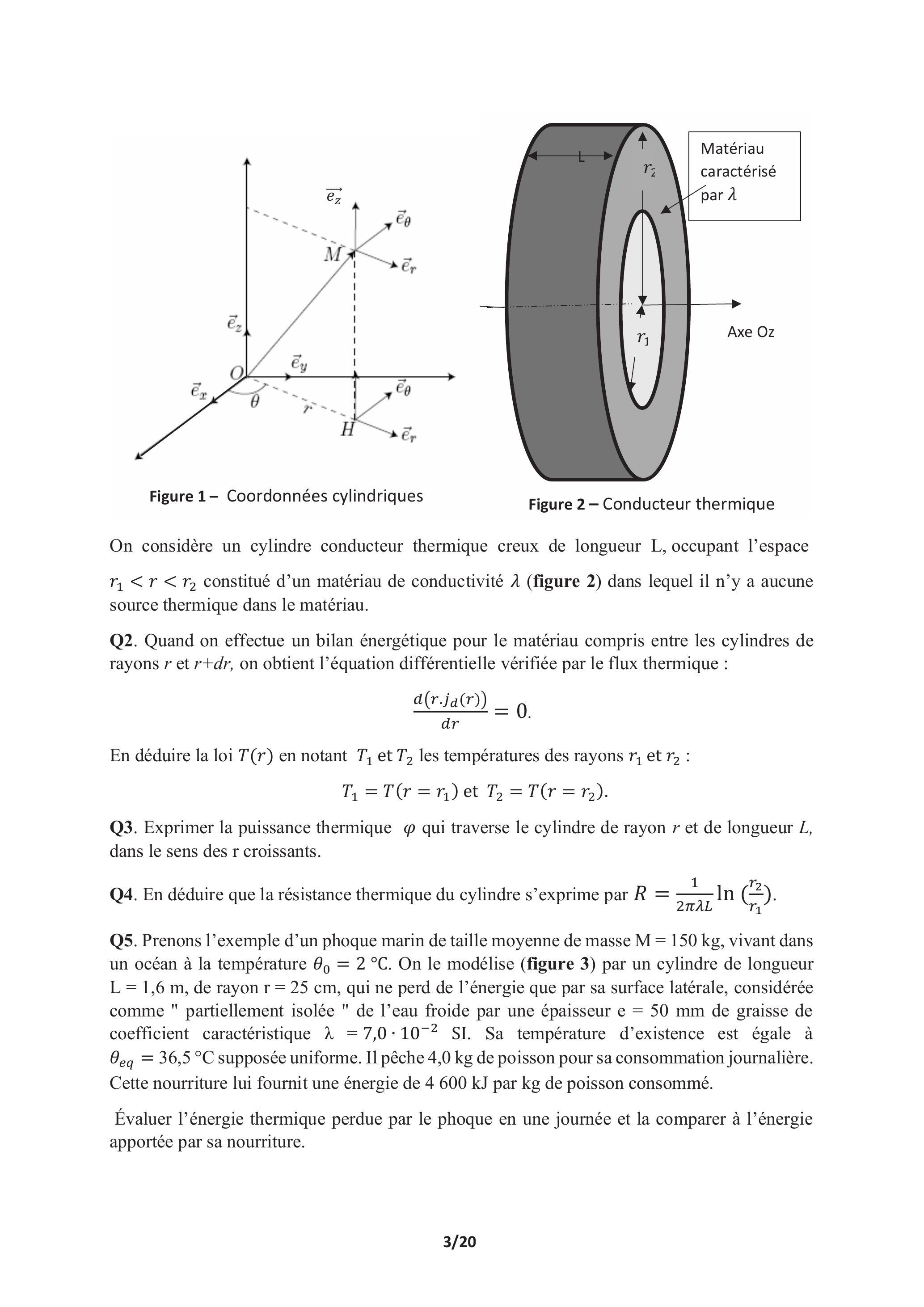Q5. Prenons l'exemple d'un phoque marin de taille moyenne de masse , vivant dans un océan à la température . On le modélise (figure 3) par un cylindre de longueur , de rayon , qui ne perd de l'énergie que par sa surface latérale, considérée comme " partiellement isolée " de l'eau froide par une épaisseur e de graisse de coefficient caractéristique . Sa température d'existence est égale à supposée uniforme. Il pêche de poisson pour sa consommation journalière. Cette nourriture lui fournit une énergie de 4600 kJ par kg de poisson consommé.