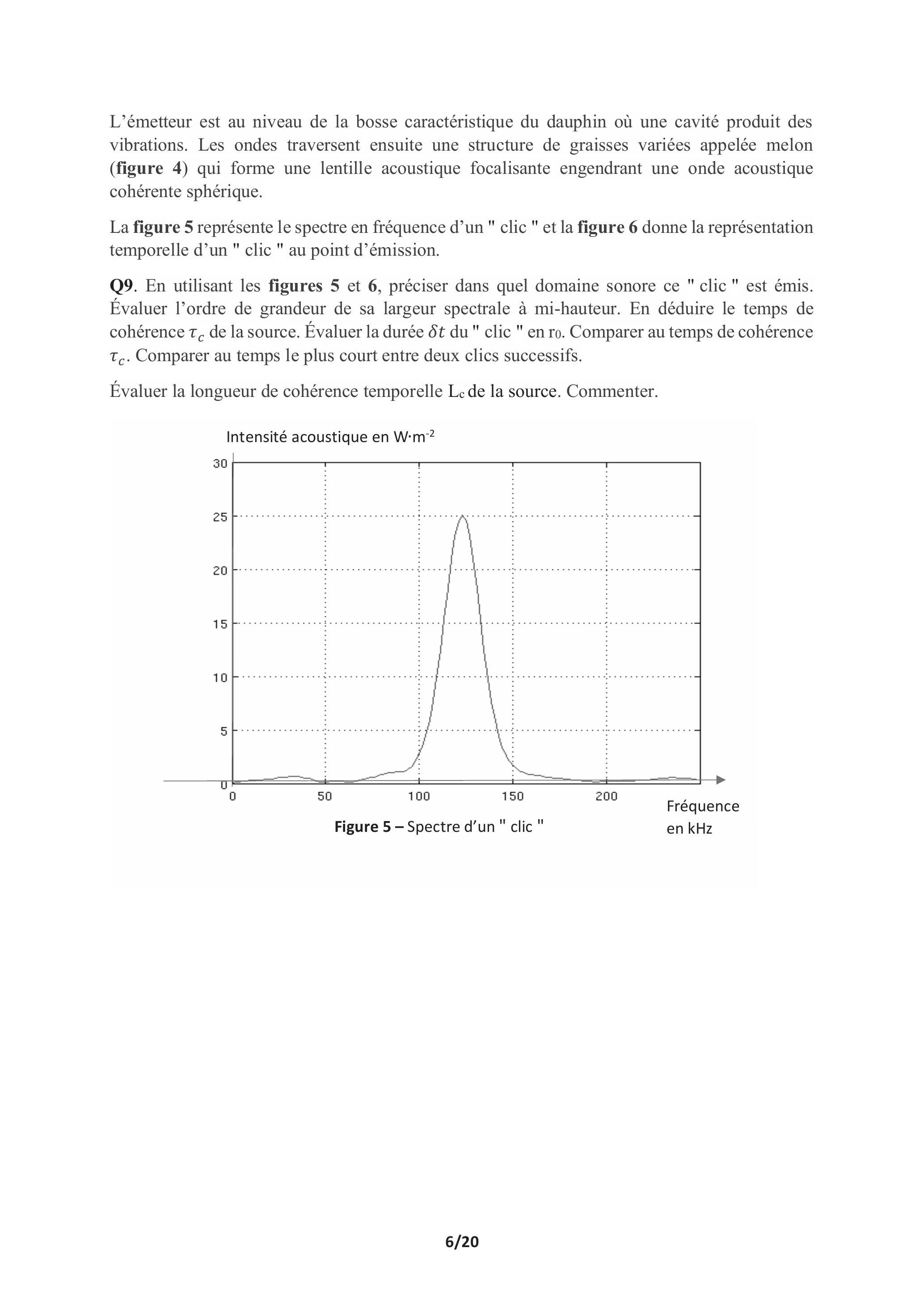 Q9. En utilisant les figures 5 et , préciser dans quel domaine sonore ce " clic " est émis. Évaluer l'ordre de grandeur de sa largeur spectrale à mi-hauteur. En déduire le temps de cohérence de la source. Évaluer la durée du " clic " en ro. Comparer au temps de cohérence . Comparer au temps le plus court entre deux clics successifs.