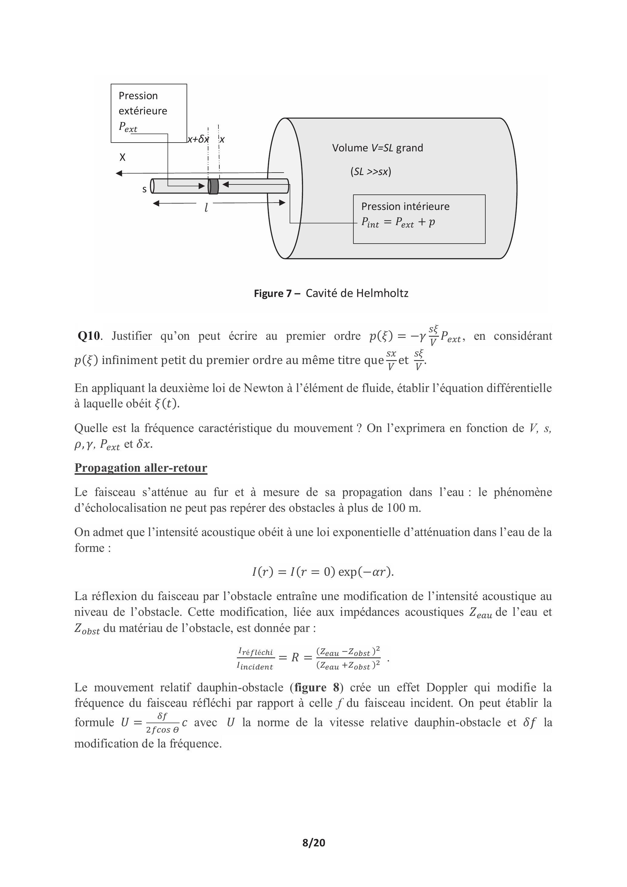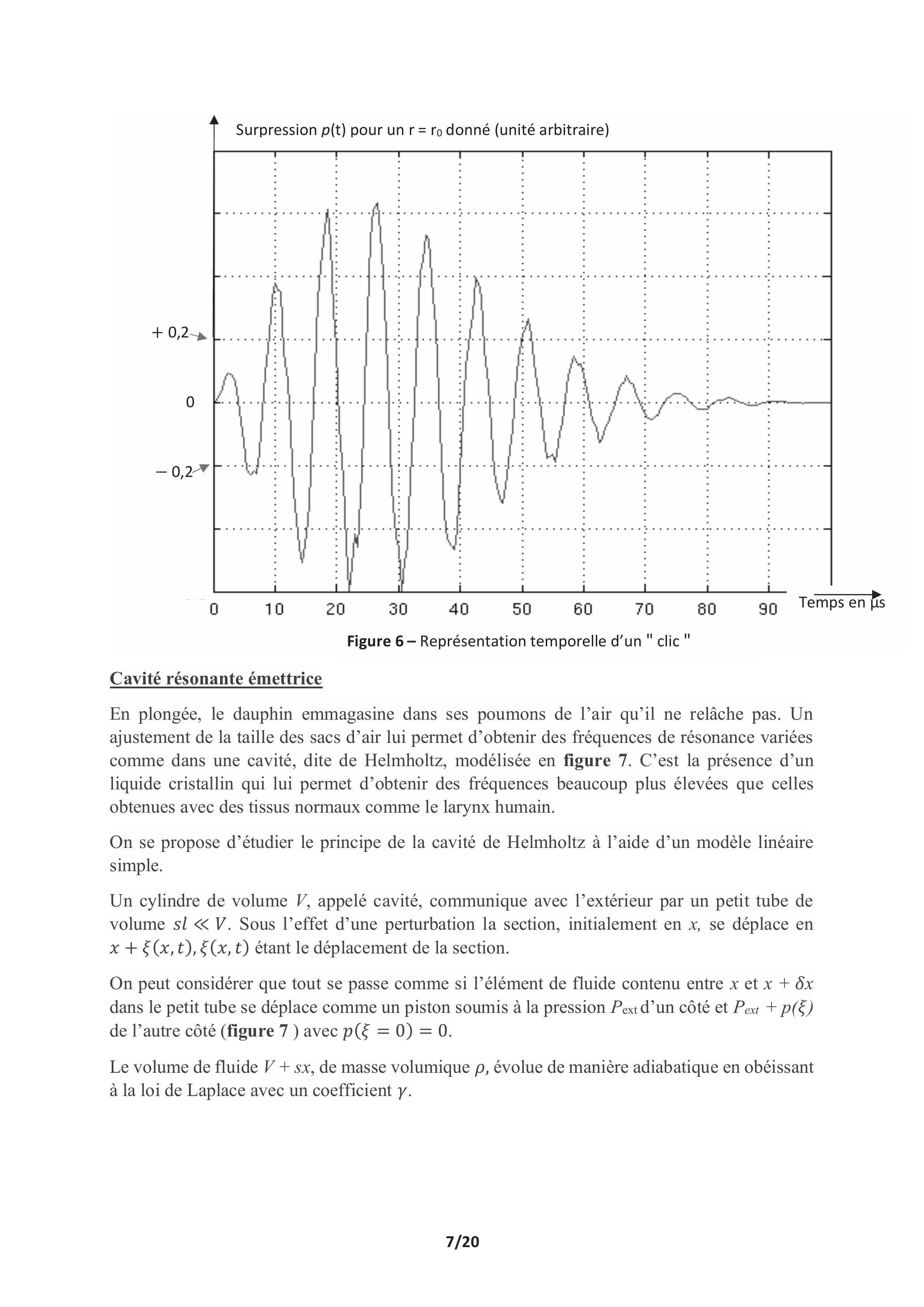 En plongée, le dauphin emmagasine dans ses poumons de l'air qu'il ne relâche pas. Un ajustement de la taille des sacs d'air lui permet d'obtenir des fréquences de résonance variées comme dans une cavité, dite de Helmholtz, modélisée en figure 7. C'est la présence d'un liquide cristallin qui lui permet d'obtenir des fréquences beaucoup plus élevées que celles obtenues avec des tissus normaux comme le larynx humain.