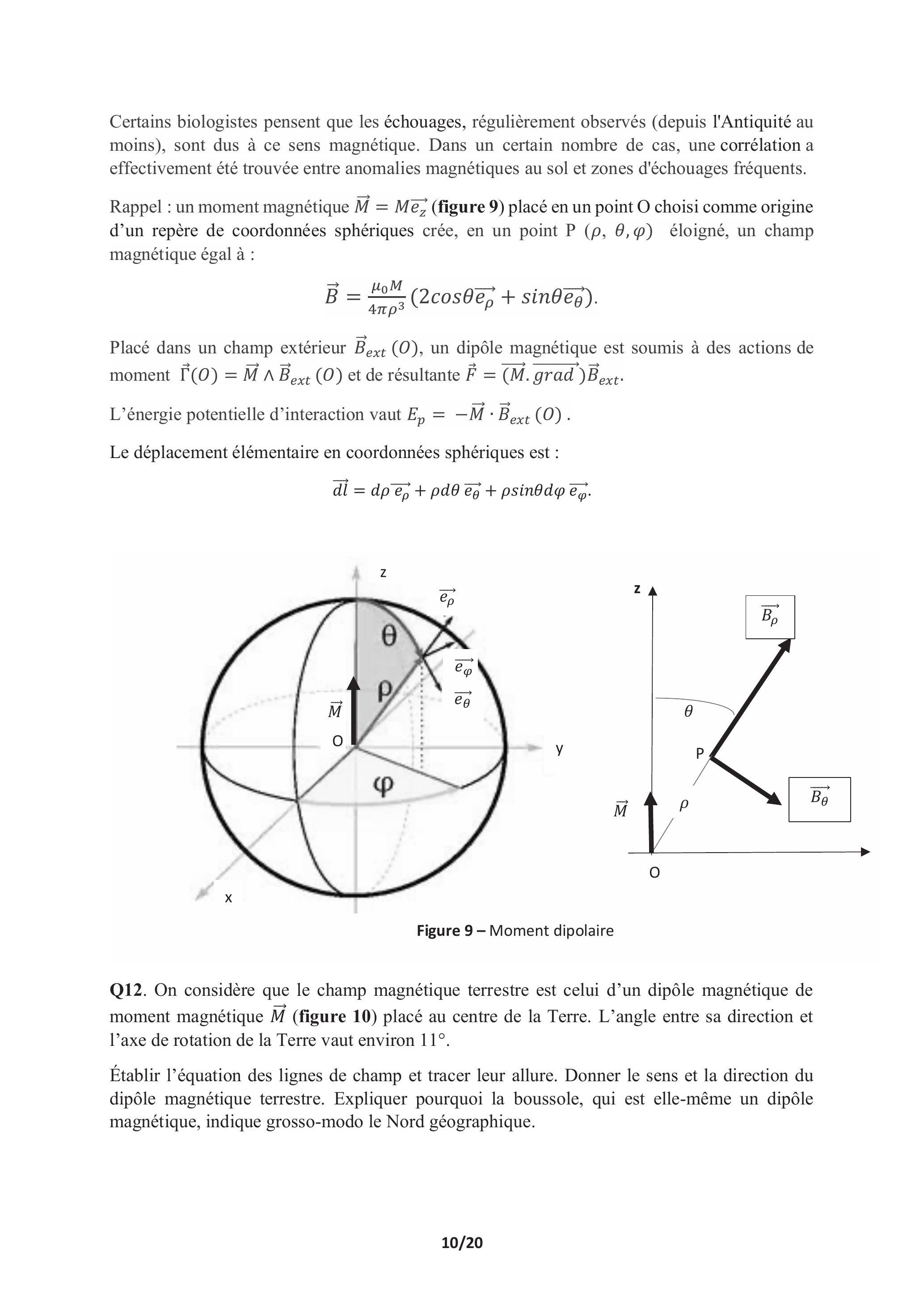 Q12. On considère que le champ magnétique terrestre est celui d'un dipôle magnétique de moment magnétique (figure 10) placé au centre de la Terre. L'angle entre sa direction et l'axe de rotation de la Terre vaut environ .