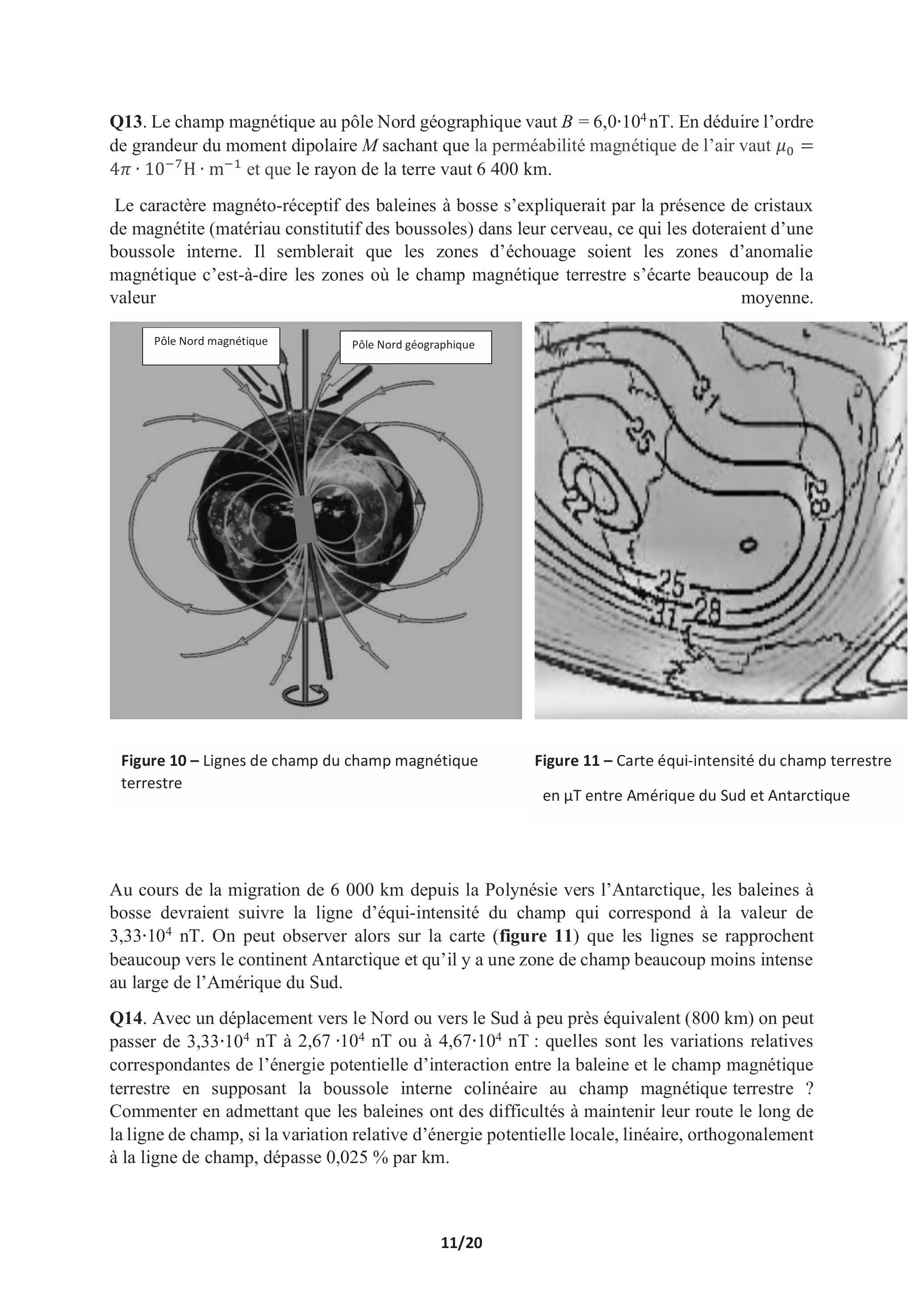 Au cours de la migration de 6000 km depuis la Polynésie vers l'Antarctique, les baleines à bosse devraient suivre la ligne d'équi-intensité du champ qui correspond à la valeur de . On peut observer alors sur la carte (figure 11) que les lignes se rapprochent beaucoup vers le continent Antarctique et qu'il y a une zone de champ beaucoup moins intense au large de l'Amérique du Sud.