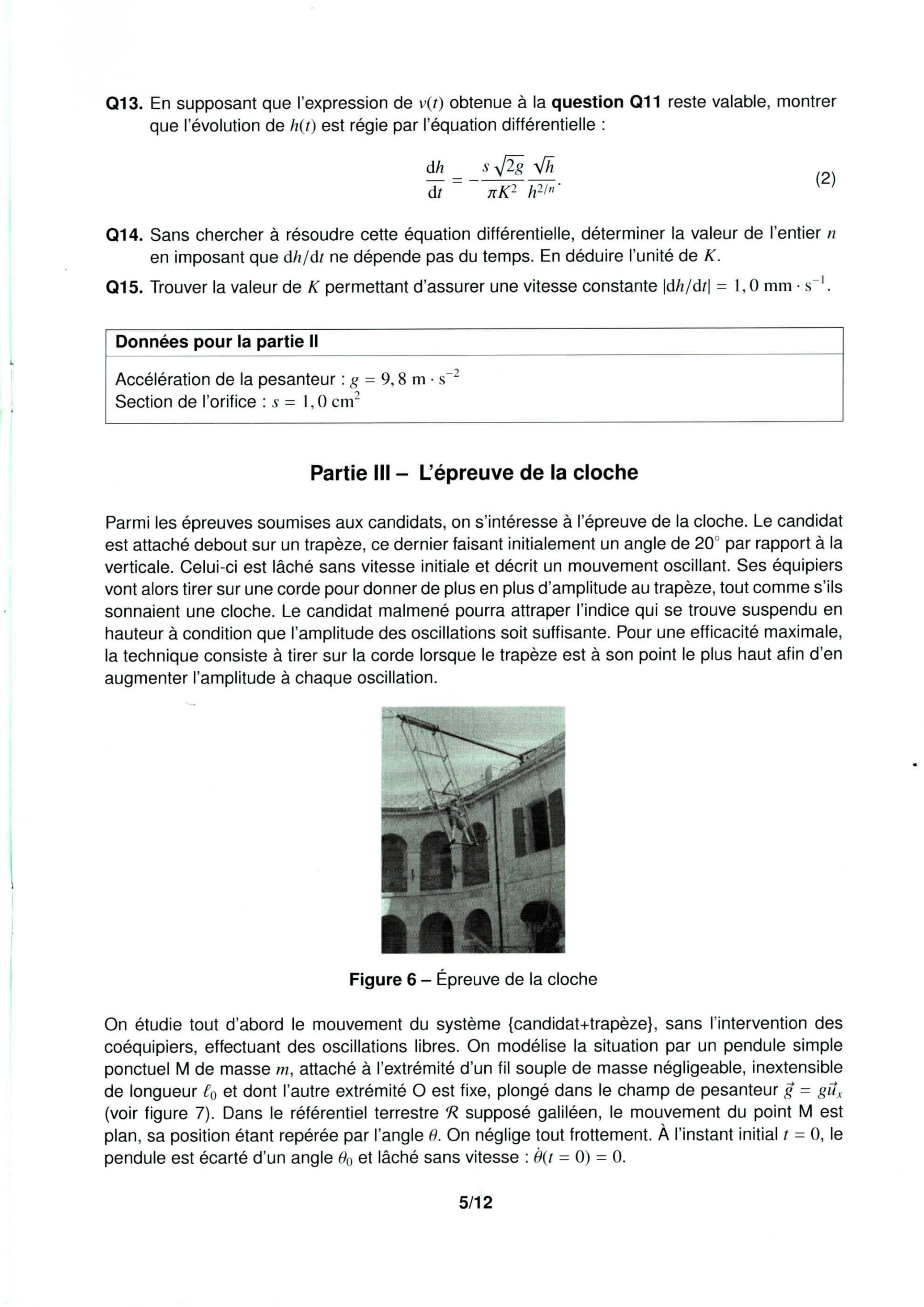 Parmi les épreuves soumises aux candidats, on s'intéresse à l'épreuve de la cloche. Le candidat est attaché debout sur un trapèze, ce dernier faisant initialement un angle de par rapport à la verticale. Celui-ci est lâché sans vitesse initiale et décrit un mouvement oscillant. Ses équipiers vont alors tirer sur une corde pour donner de plus en plus d'amplitude au trapèze, tout comme s'ils sonnaient une cloche. Le candidat malmené pourra attraper l'indice qui se trouve suspendu en hauteur à condition que l'amplitude des oscillations soit suffisante. Pour une efficacité maximale, la technique consiste à tirer sur la corde lorsque le trapèze est à son point le plus haut afin d'en augmenter l'amplitude à chaque oscillation.