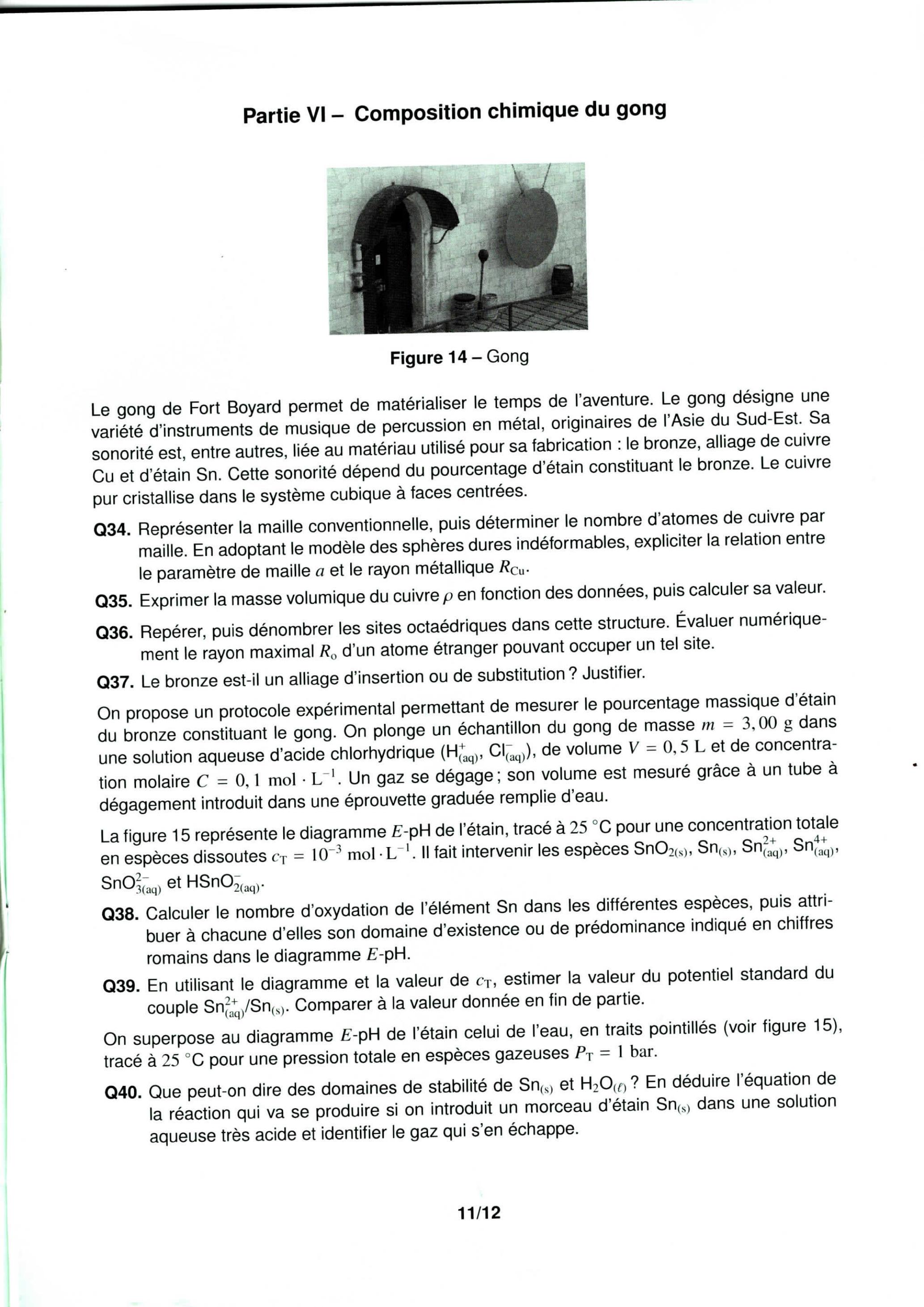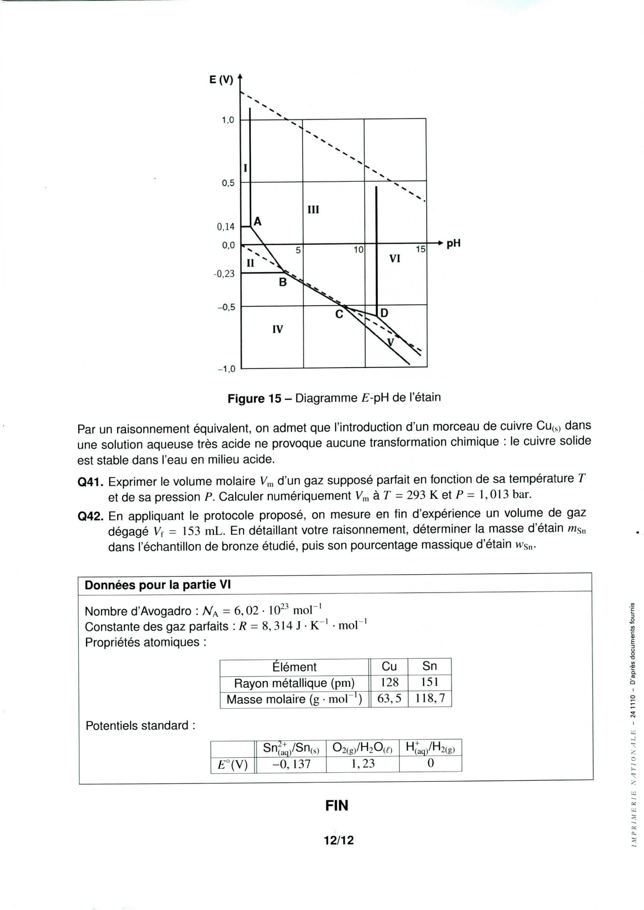 Q42. En appliquant le protocole proposé, on mesure en fin d'expérience un volume de gaz dégagé . En détaillant votre raisonnement, déterminer la masse d'étain dans l'échantillon de bronze étudié, puis son pourcentage massique d'étain .