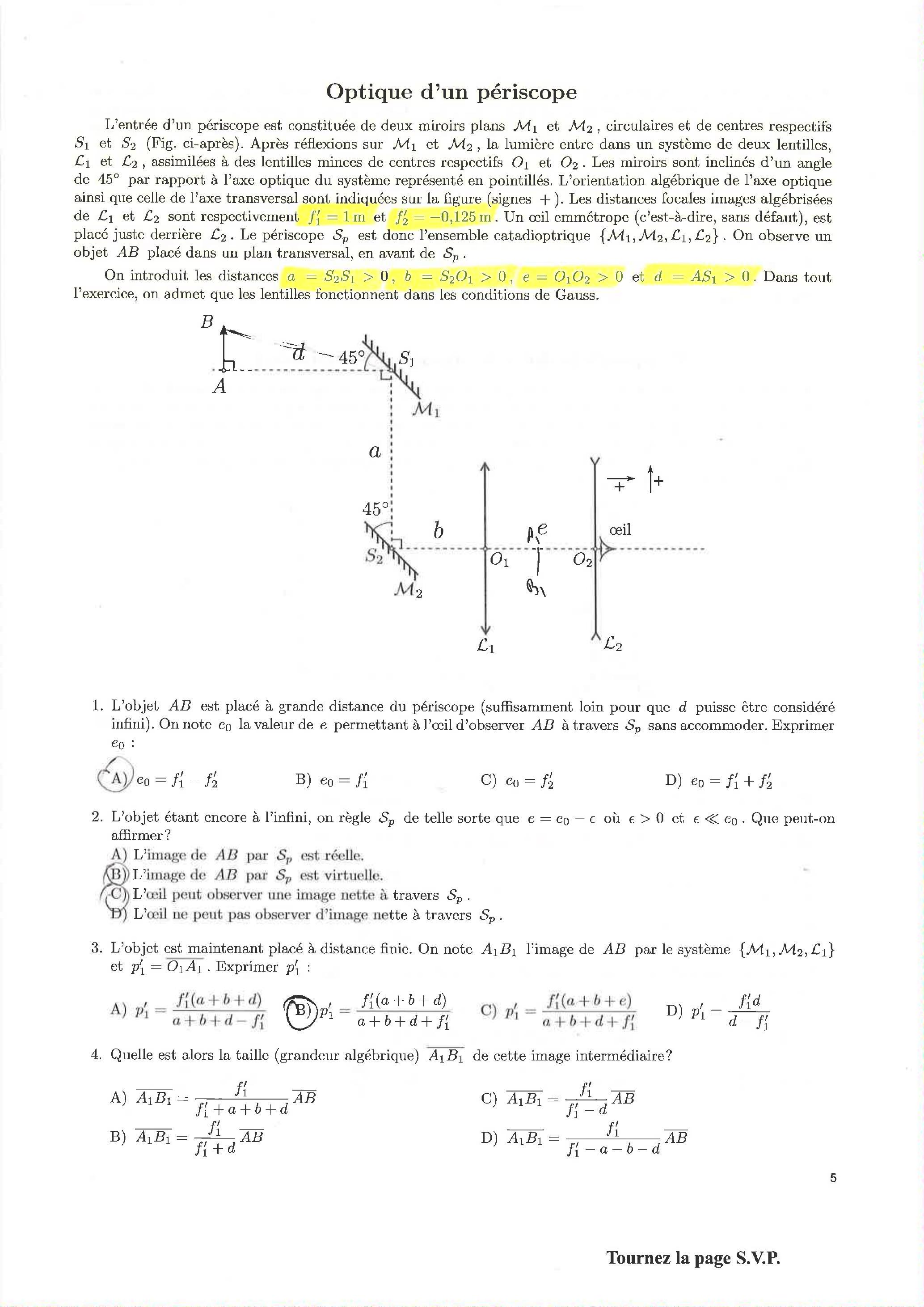L'entrée d'un périscope est constituée de deux miroirs plans et , circulaires et de centres respectifs et (Fig. ci-après). Après réflexions sur et , la lumière entre dans un système de deux lentilles, et , assimilées à des lentilles minces de centres respectifs et . Les miroirs sont inclinés d'un angle de par rapport à l'axe optique du système représenté en pointillés. L'orientation algébrique de l'axe optique ainsi que celle de l'axe transversal sont indiquées sur la figure (signes + ). Les distances focales images algébrisées de et sont respectivement et . Un œil emmétrope (c'est-à-dire, sans défaut), est placé juste derrière . Le périscope est donc l'ensemble catadioptrique . On observe un objet placé dans un plan transversal, en avant de .
