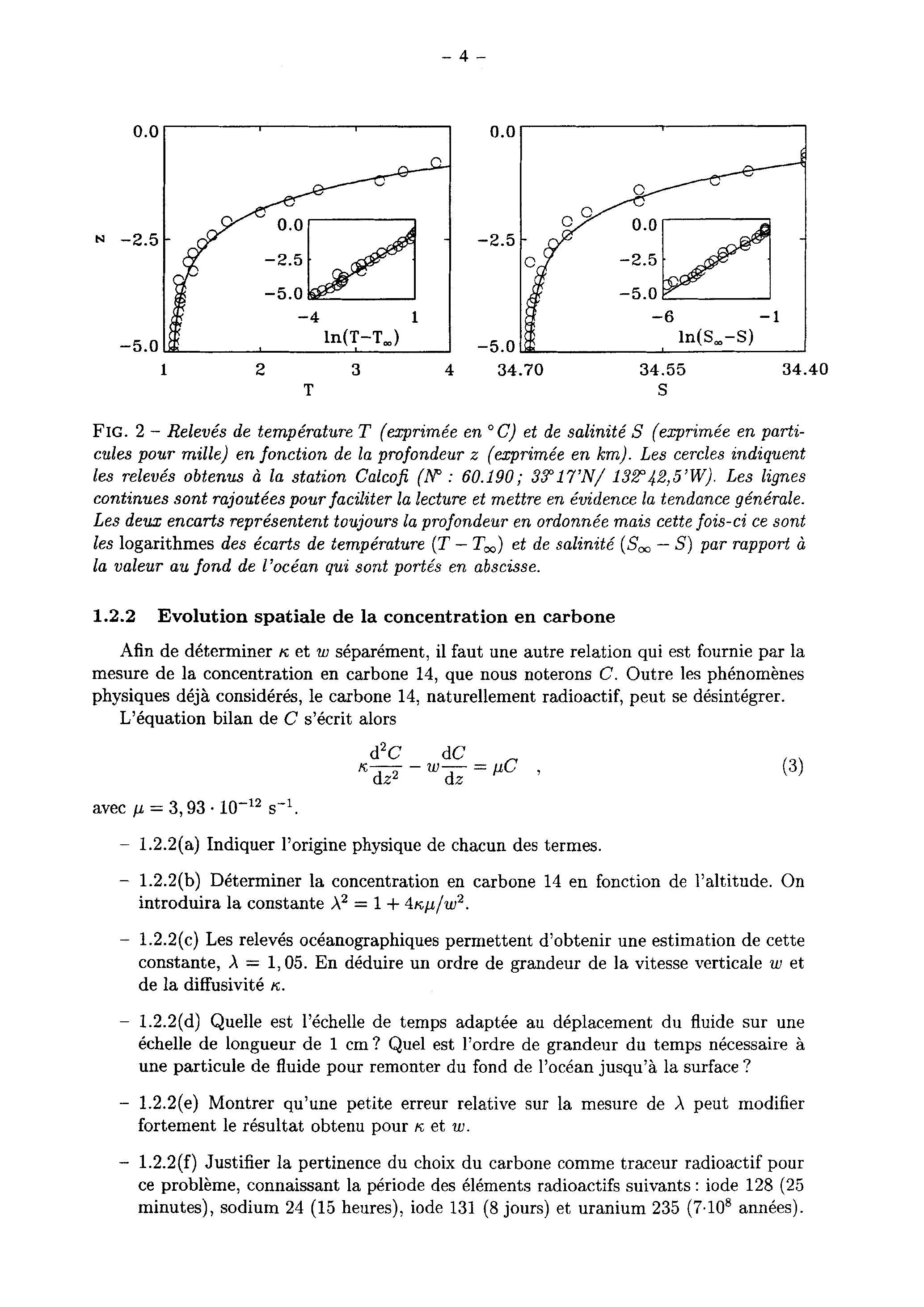 1.2.1(c) Montrer que les relevés océanographiques de température et de salinité présentés dans la figure (2) mettent en évidence une grandeur caractéristique. Quelle relation entre et peut-on donc tirer des relevés océanographiques et des équations ci-dessus?