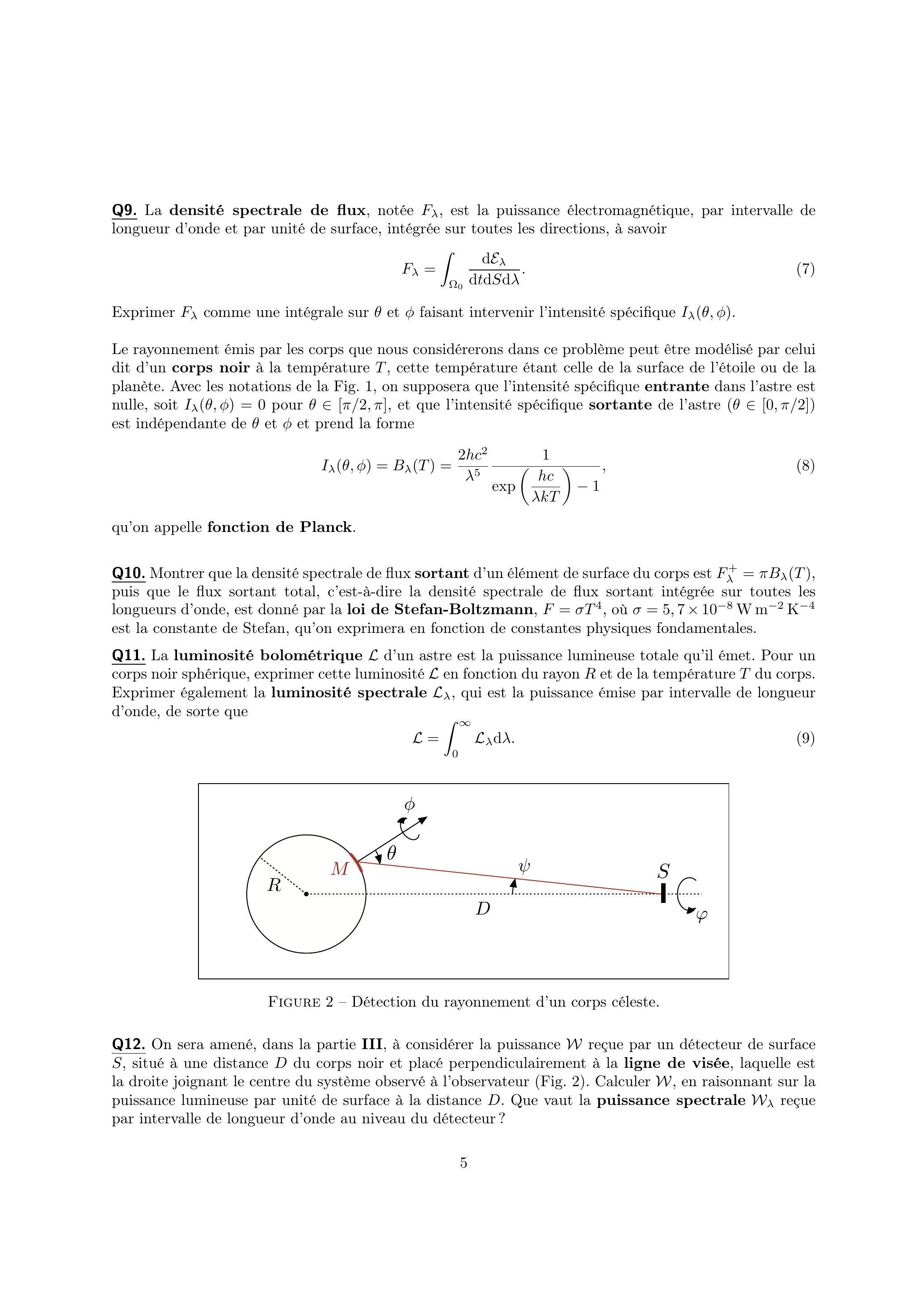 Nous allons nous intéresser dans ce problème à quelques uns des aspects de la physique mise en jeu pour la détection et la caractérisation des exoplanètes. L'information permettant de mettre en évidence ces exoplanètes étant de nature électromagnétique, la première partie introduit les grandeurs physiques utiles dans le traitement des questions de rayonnement. La deuxième partie traite de la méthode des vitesses radiales, qui a permis les premières découvertes. La troisième partie traite de la méthode des transits, mise à l'honneur par la mission spatiale Kepler. Si la problématique est commune aux différentes parties du problème, celles-ci sont néanmoins très largement indépendantes. On précise que dans tout le problème, les notations en gras représentent des vecteurs. En particulier, la notation rot