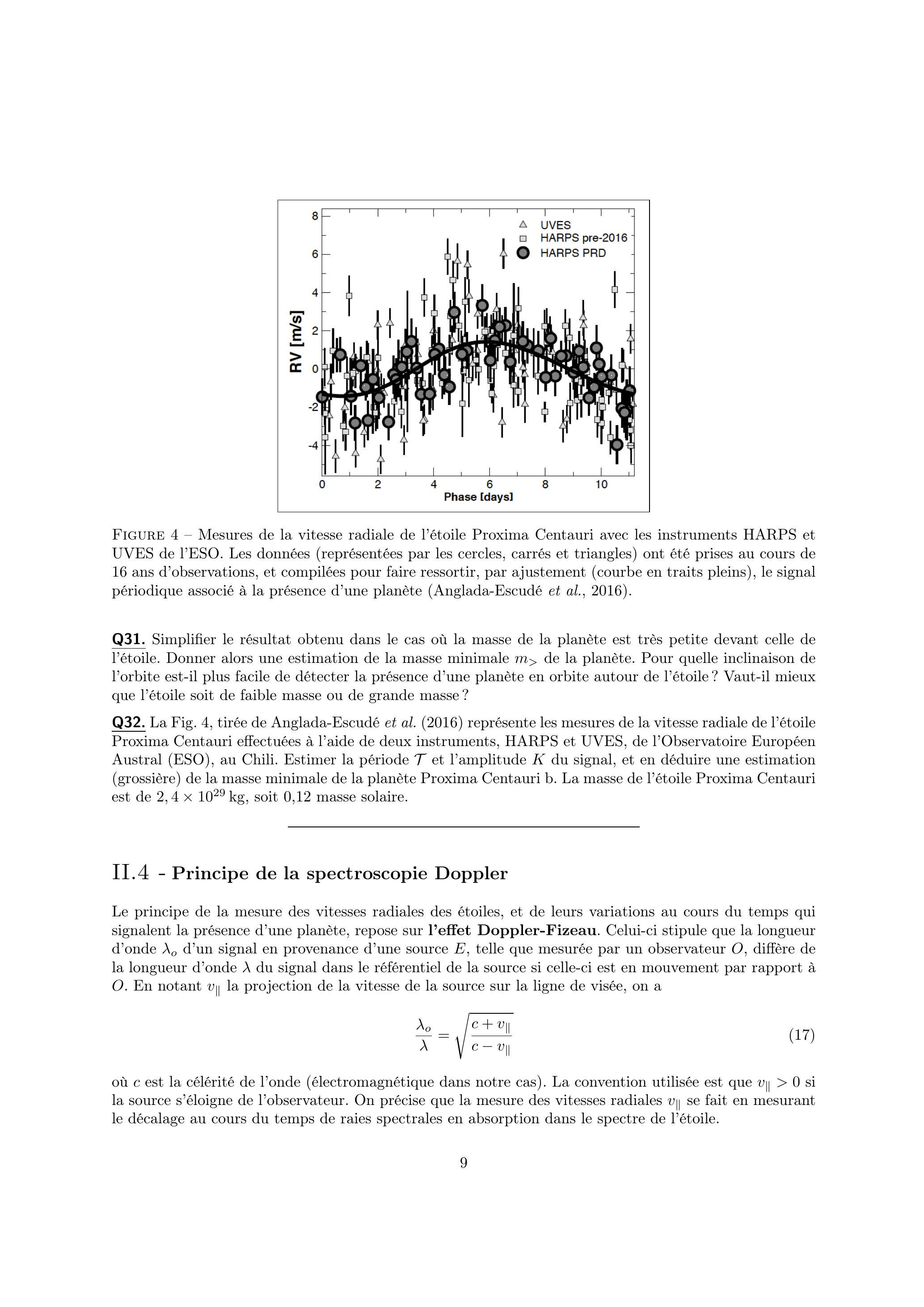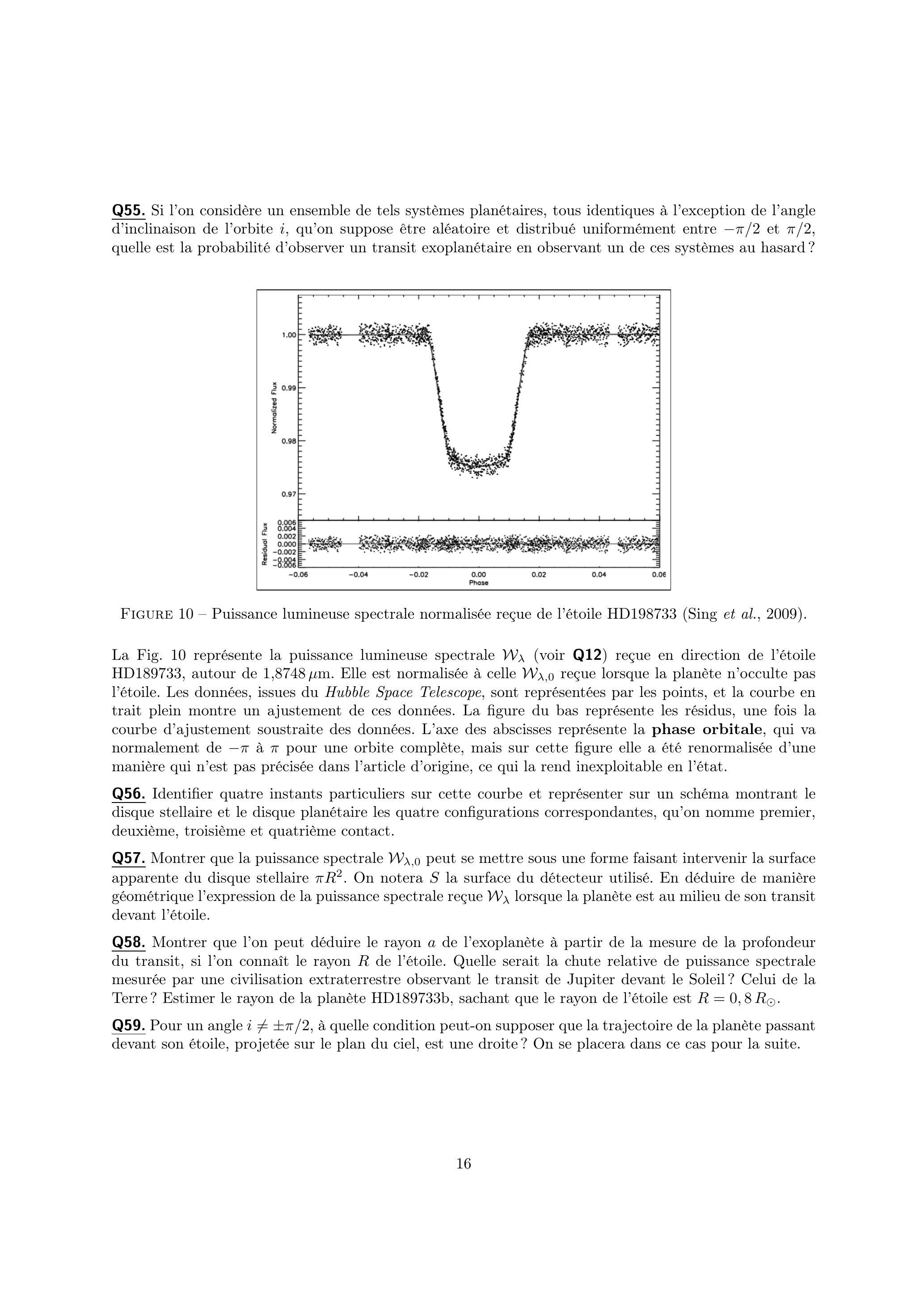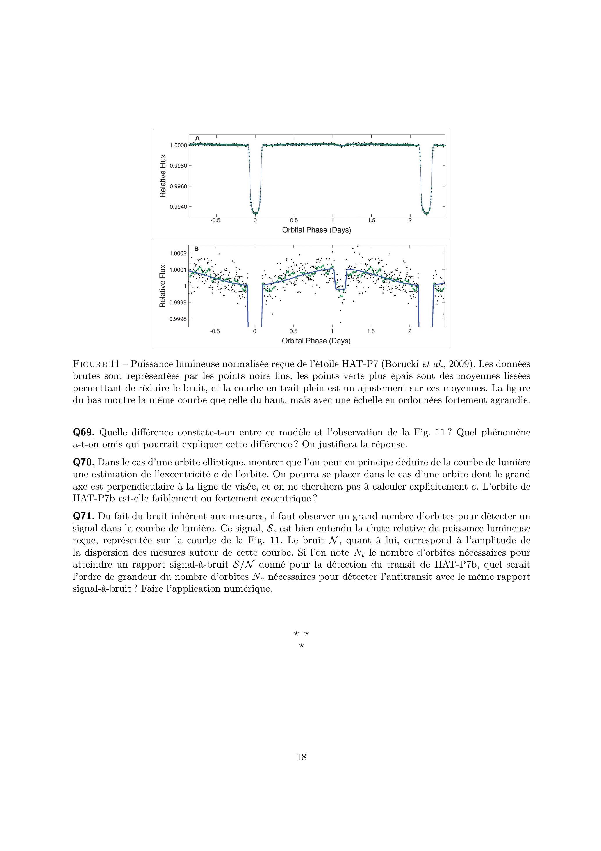 Q71. Du fait du bruit inhérent aux mesures, il faut observer un grand nombre d'orbites pour détecter un signal dans la courbe de lumière. Ce signal, , est bien entendu la chute relative de puissance lumineuse reçue, représentée sur la courbe de la Fig. 11. Le bruit