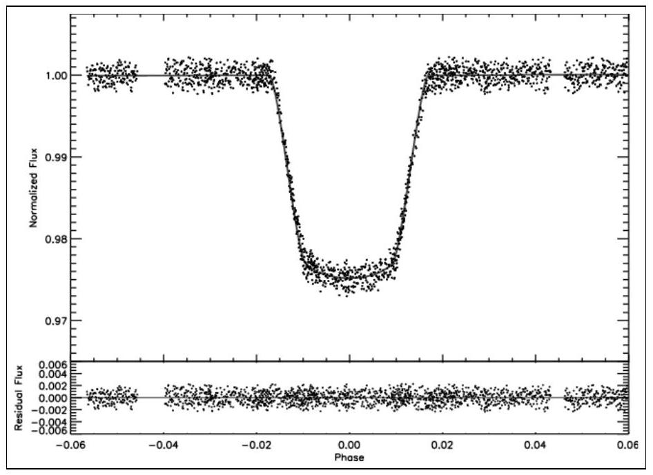reçue lorsque la planète n'occulte pas l'étoile. Les données, issues du Hubble Space Telescope, sont représentées par les points, et la courbe en trait plein montre un ajustement de ces données. La figure du bas représente les résidus, une fois la courbe d'ajustement soustraite des données. L'axe des abscisses représente la phase orbitale, qui va normalement de