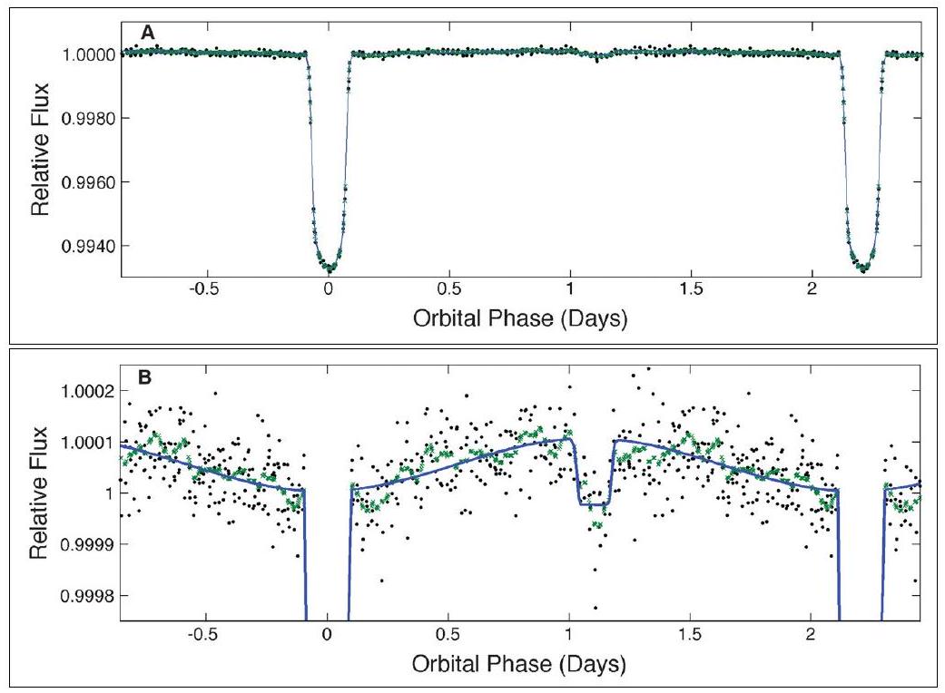 uniformément sur toute sa surface, et on fait l'hypothèse que, comme l'étoile, elle se comporte comme un corps noir. Cette modélisation va nous permettre d'interpréter la Fig. 11, qui représente la courbe de lumière observée par la mission spatiale Kepler en direction de l'étoile HAT-P7, sur plus d'une période orbitale. Les données brutes sont représentées par les points noirs fins, les points verts plus épais sont des moyennes lissées permettant de réduire le bruit, et la courbe en trait plein est un ajustement sur ces moyennes. La figure du bas montre la même courbe mais avec une échelle en ordonnées fortement agrandie.