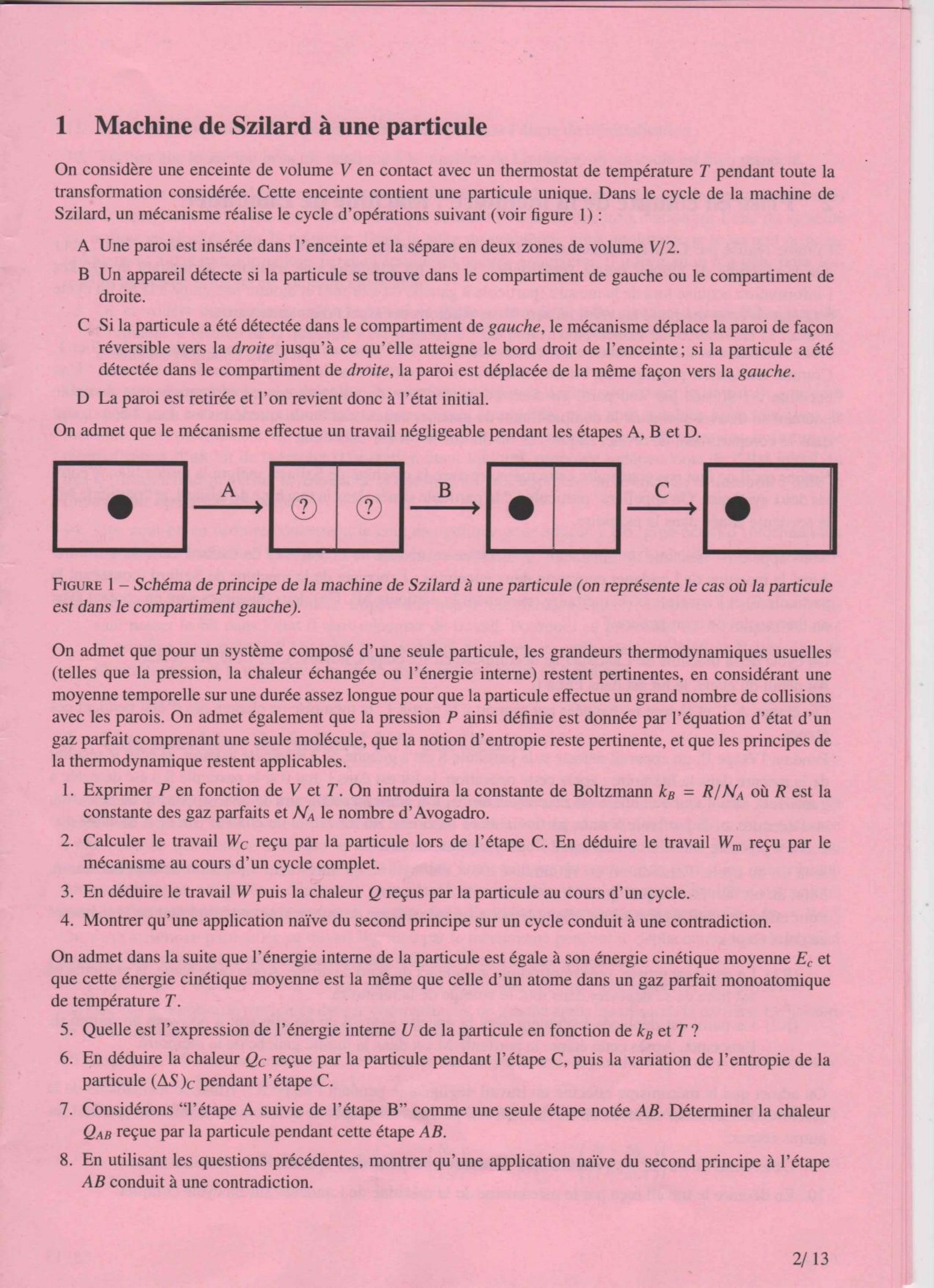 Dans le cadre de ce problème, nous n'irons pas plus loin dans la résolution des contradictions constatées dans les questions 4 et 8 , qui sont liées au fait que pendant l'étape B, une information sur l'état du système est acquise et stockée dans la mémoire. Dans la suite du problème, nous appliquerons le second principe uniquement à des transformations pendant lesquelles aucune acquisition d'information n'a lieu, pour lesquelles le second principe est toujours applicable.