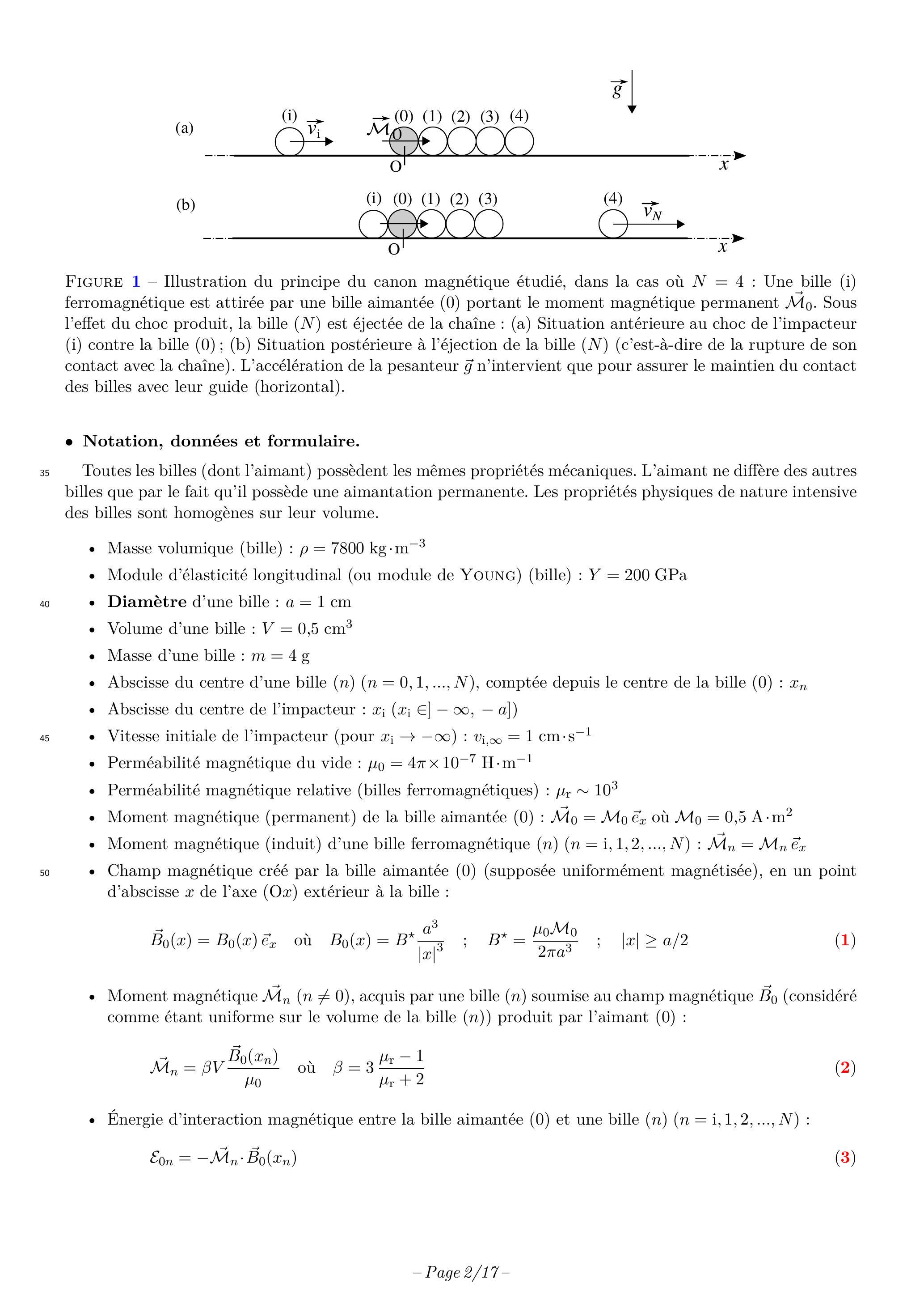 Nous nous intéressons à un dispositif d'éjection de projectile (que nous appellerons un canon) dont l'élément moteur est un aimant. Ce dernier est une bille placée au point O d'un guide rectiligne horizontal orienté par l'axe ( ). Nous l'identifions par le label ( 0 ). On dispose, sur ce guide, autres billes ferromagnétiques mais non aimantées , côte à côte. Elles portent les labels (1) à ( ). La bille (1) est en contact avec l'aimant (0). Enfin, une bille ferromagnétique, portant le label (i) et que nous appellerons impacteur, est lancée depuis une abscisse en direction de l'aimant ( 0 ), le long du rail de guidage et selon la vitesse initiale . Le choc de l'impacteur sur l'aimant (0) produit une onde mécanique le long de la chaîne de billes qui conduit à l'éjection de la bille ( ) (les autres billes restant immobiles et jointives après le choc de l'impacteur). Ce phénomène est illustré sur la figure (1). Afin d'éviter le recul de la chaîne de billes lors de la phase d'approche de l'impacteur, une butée (non représentée sur la figure) interdit le mouvement vers l'arrière de l'aimant (0).