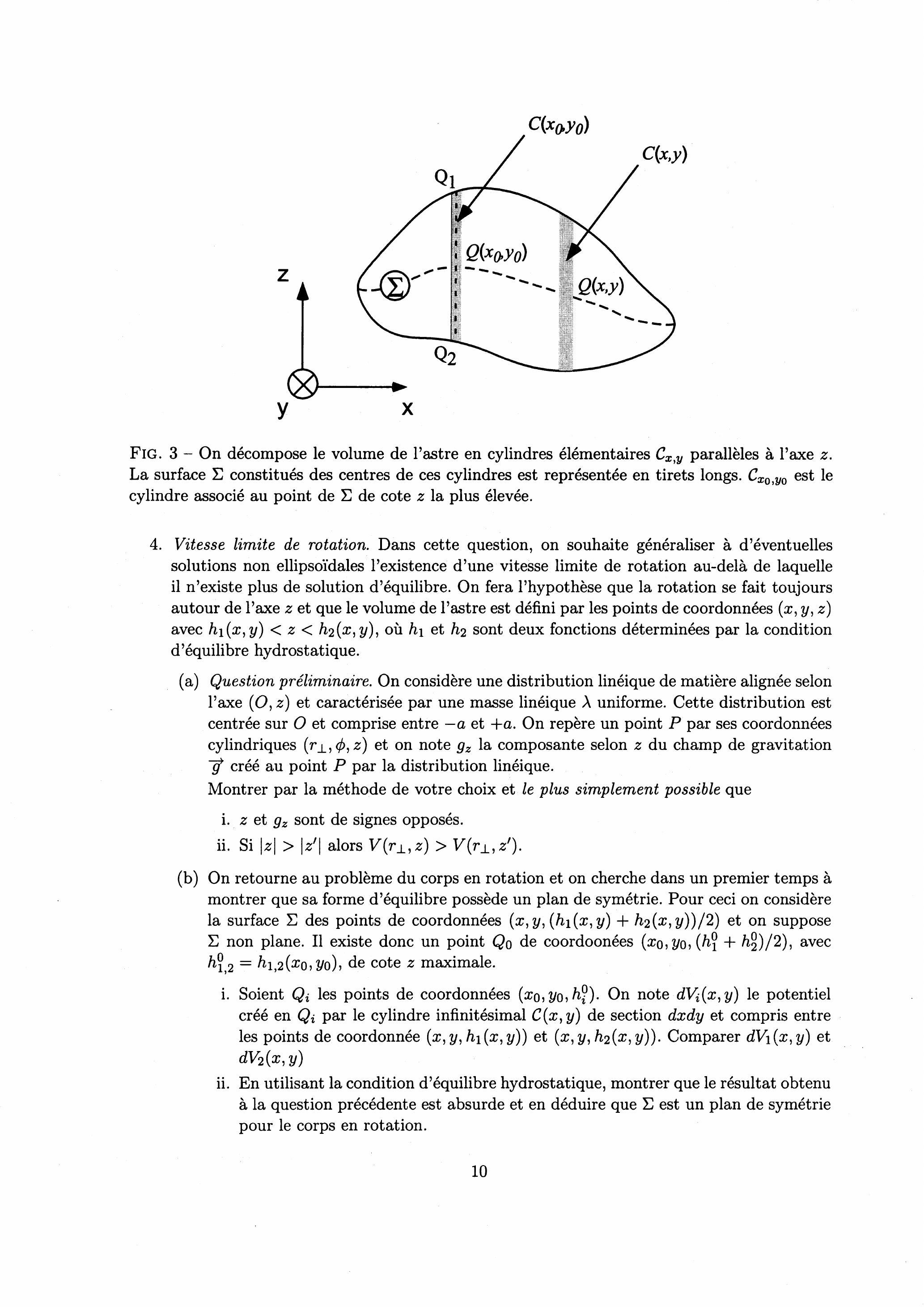 Vitesse limite de rotation. Dans cette question, on souhaite généraliser à d'éventuelles solutions non ellipsoïdales l'existence d'une vitesse limite de rotation au-delà de laquelle il n'existe plus de solution d'équilibre. On fera l'hypothèse que la rotation se fait toujours autour de l'axe et que le volume de l'astre est défini par les points de coordonnées ( ) avec , où et sont deux fonctions déterminées par la condition d'équilibre hydrostatique.