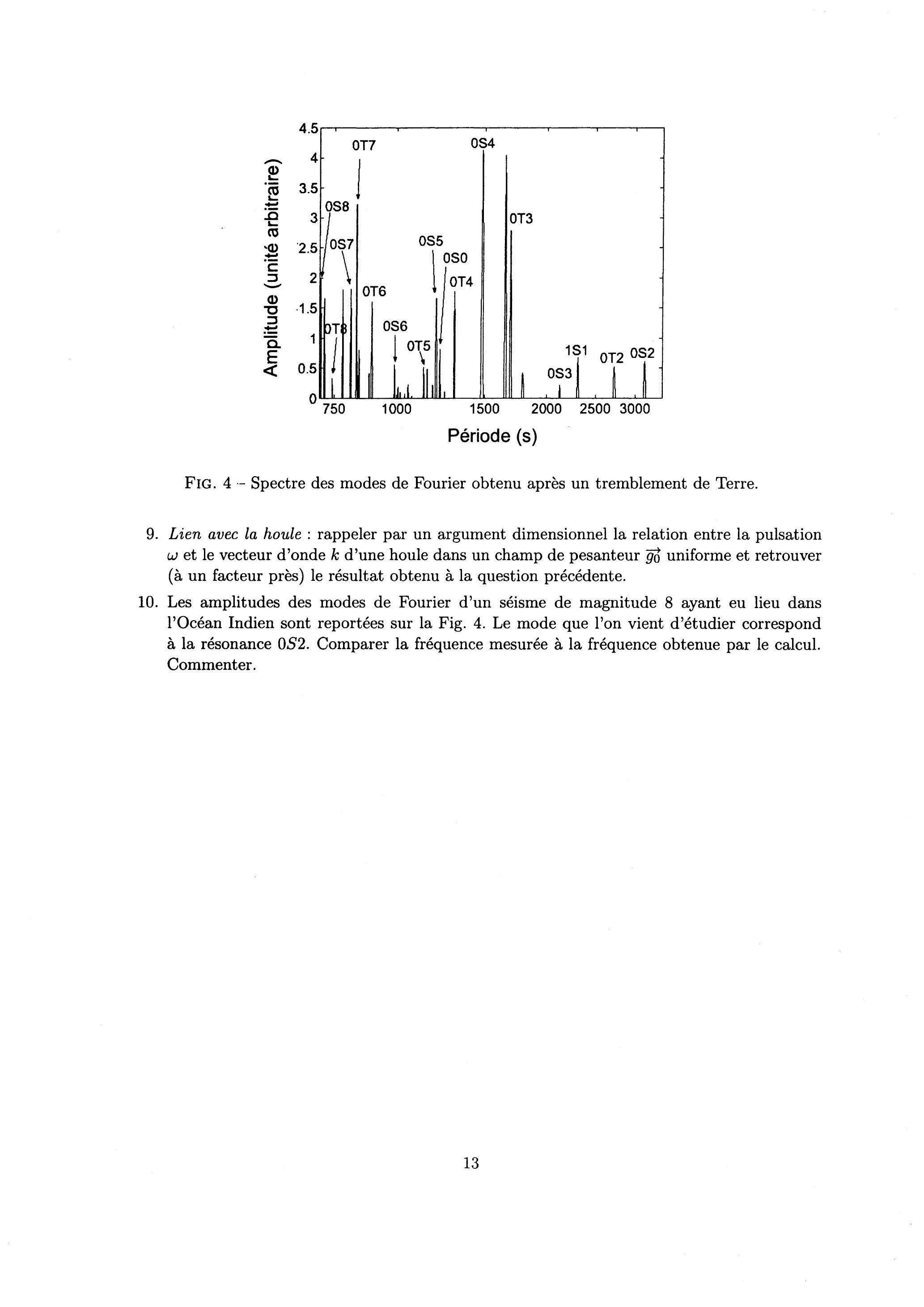 Les amplitudes des modes de Fourier d'un séisme de magnitude 8 ayant eu lieu dans l'Océan Indien sont reportées sur la Fig. 4. Le mode que l'on vient d'étudier correspond à la résonance . Comparer la fréquence mesurée à la fréquence obtenue par le calcul. Commenter.