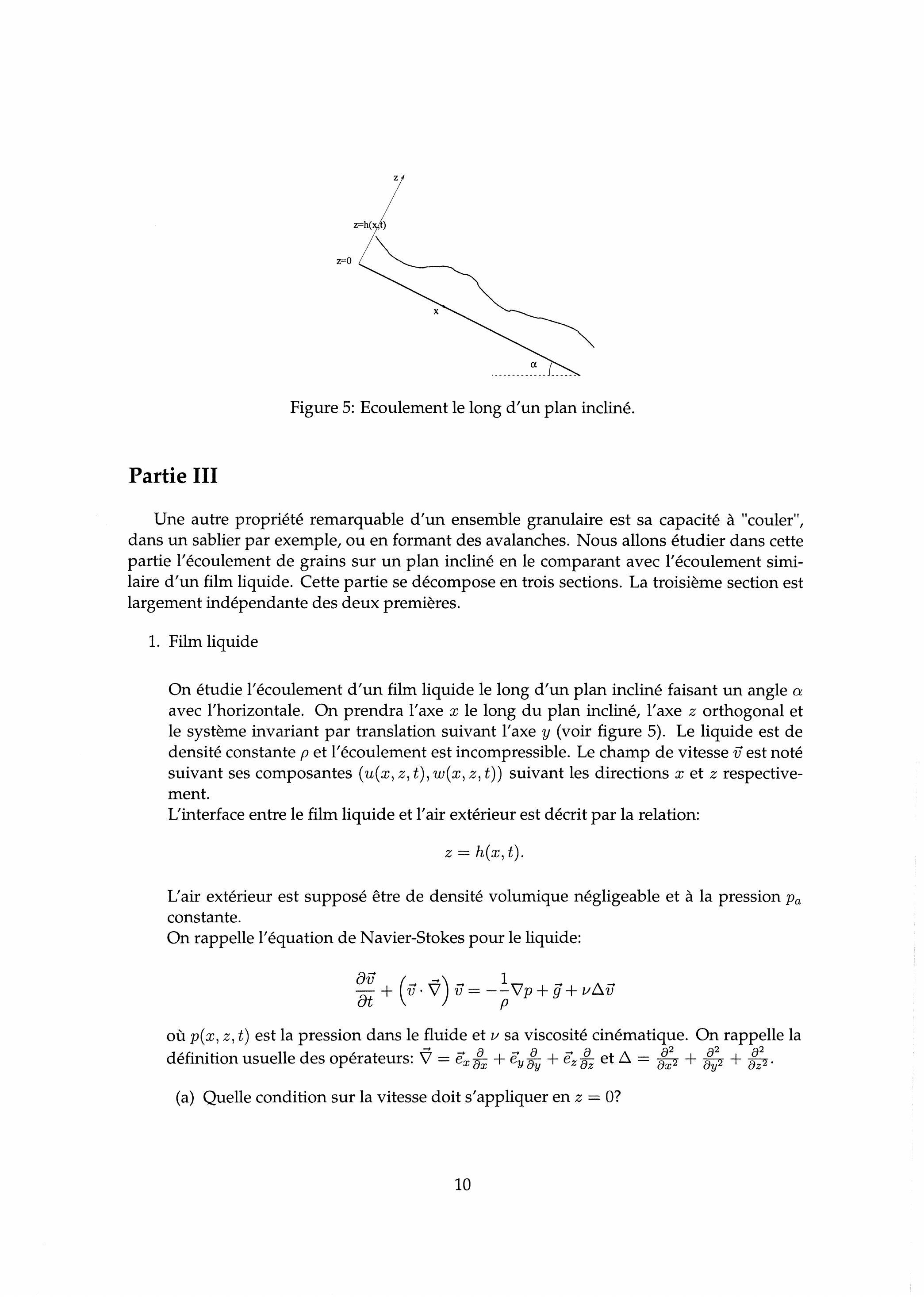On étudie l'écoulement d'un film liquide le long d'un plan incliné faisant un angle avec l'horizontale. On prendra l'axe le long du plan incliné, l'axe orthogonal et le système invariant par translation suivant l'axe (voir figure 5). Le liquide est de densité constante et l'écoulement est incompressible. Le champ de vitesse est noté suivant ses composantes ( ) suivant les directions et respectivement.