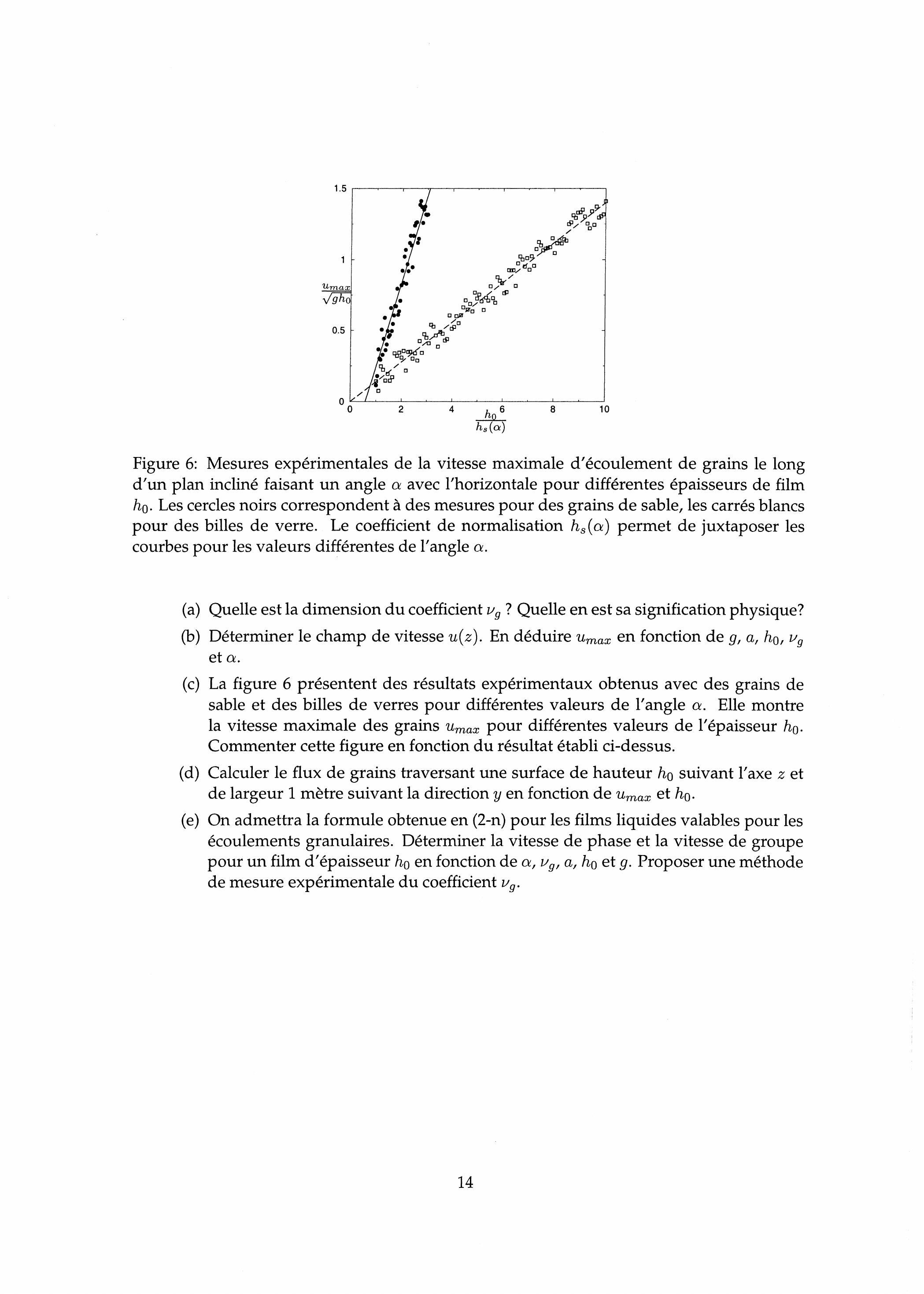 (c) La figure 6 présentent des résultats expérimentaux obtenus avec des grains de sable et des billes de verres pour différentes valeurs de l'angle . Elle montre la vitesse maximale des grains pour différentes valeurs de l'épaisseur . Commenter cette figure en fonction du résultat établi ci-dessus.