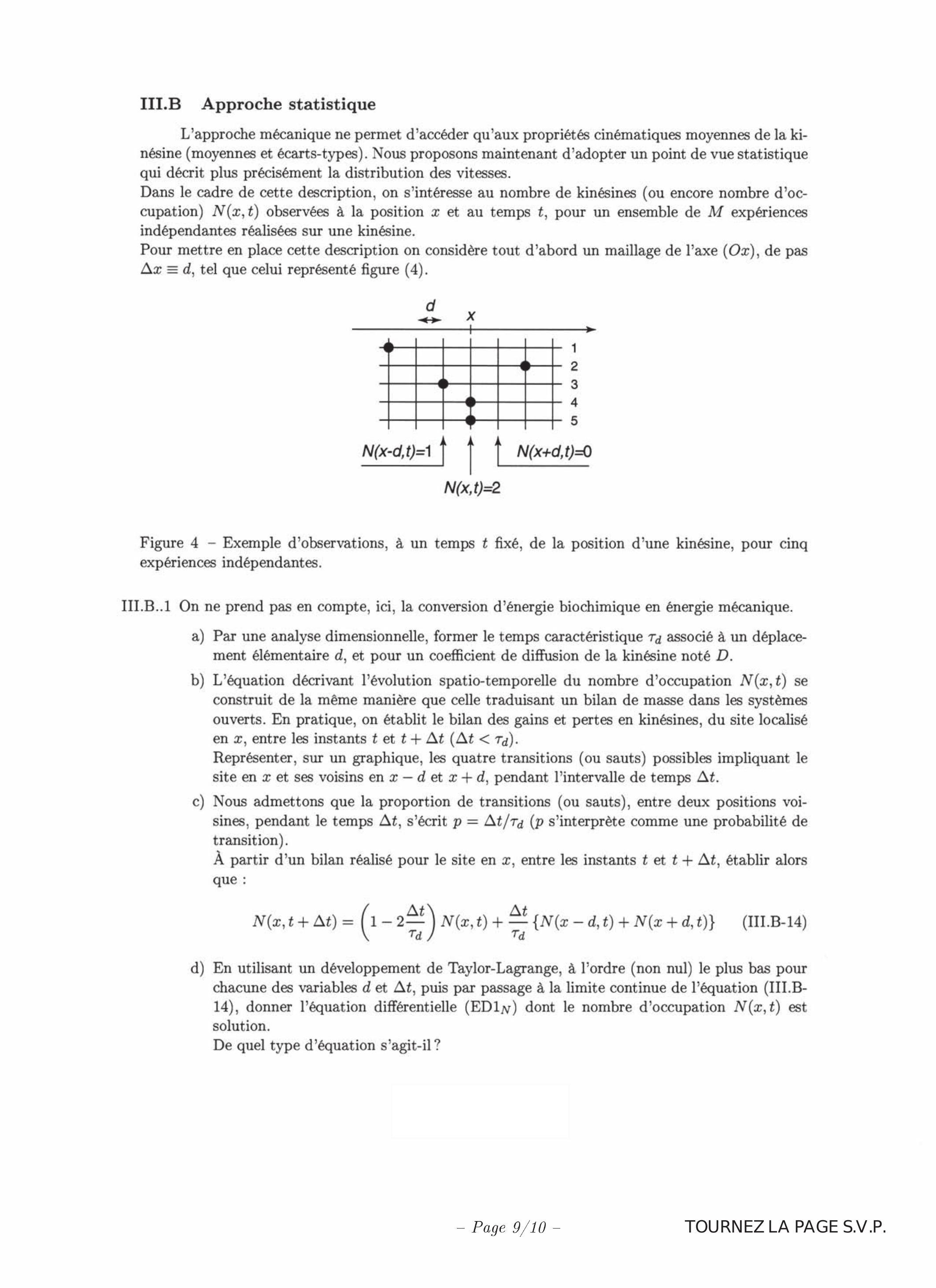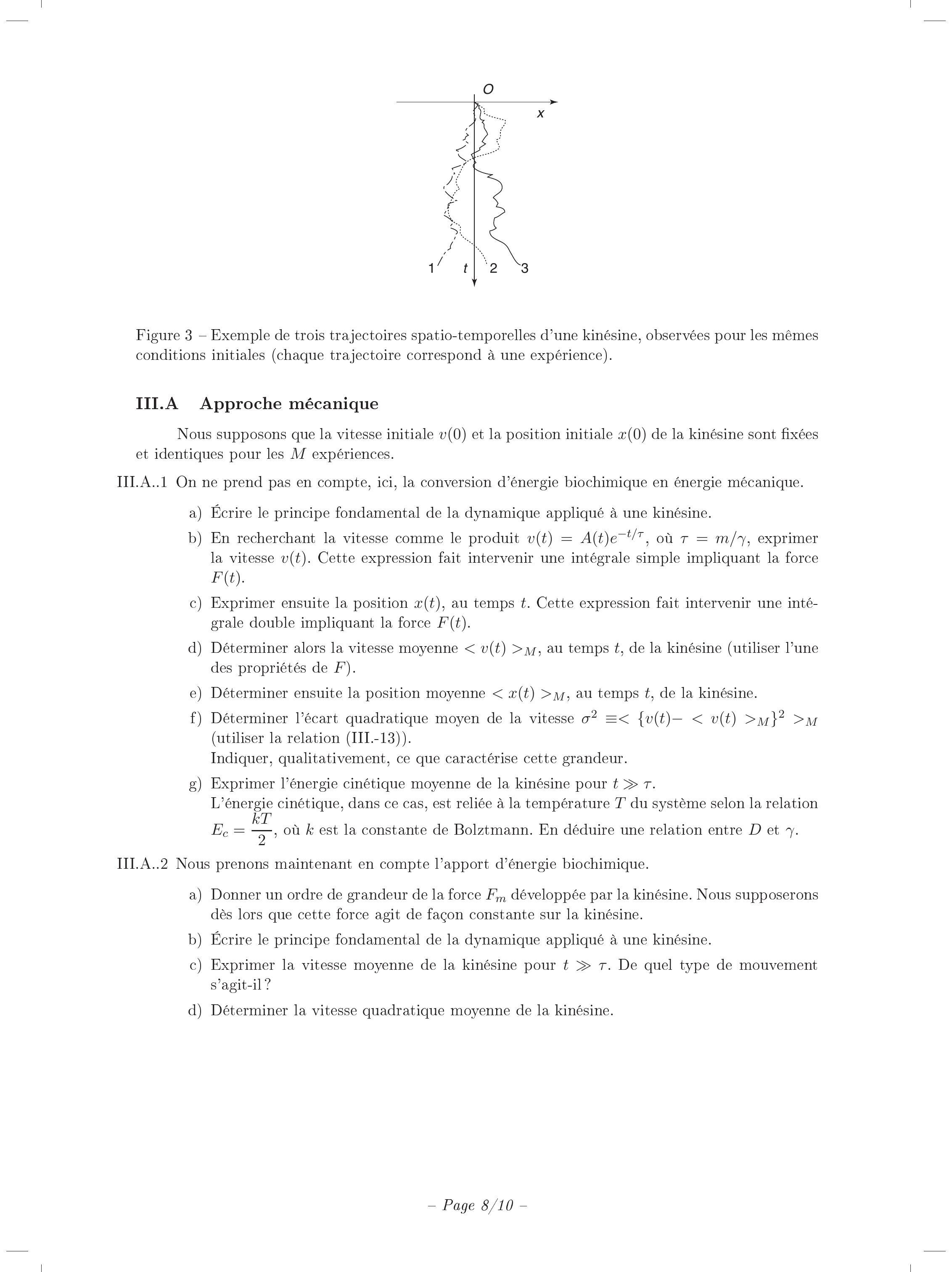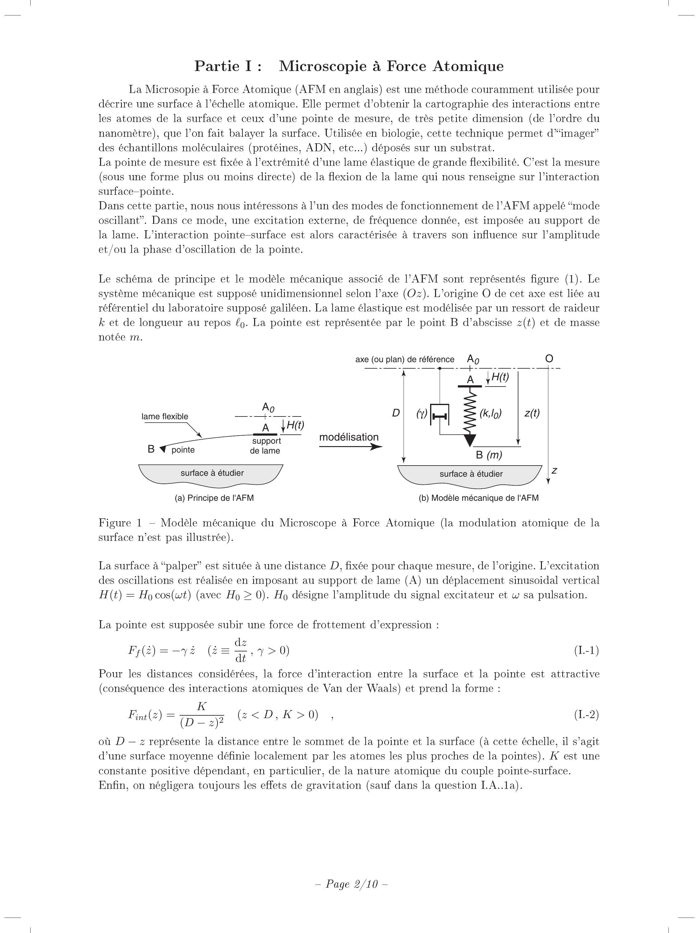 Ce sujet traite de problèmes physiques liés à la biologie. Néanmoins, aucune connaissance particulière en biologie autre que celles fournies dans l'énoncé n'est nécessaire pour répondre aux questions. Le sujet comprend trois parties indépendantes. Elles étudient respectivement le Microscope à Force Atomique, la transmission de l'influx nerveux dans un axone, et les propriétés de moteur moléculaire de la kinésine. Cette dernière partie est subdivisée en deux sous parties indépendantes.