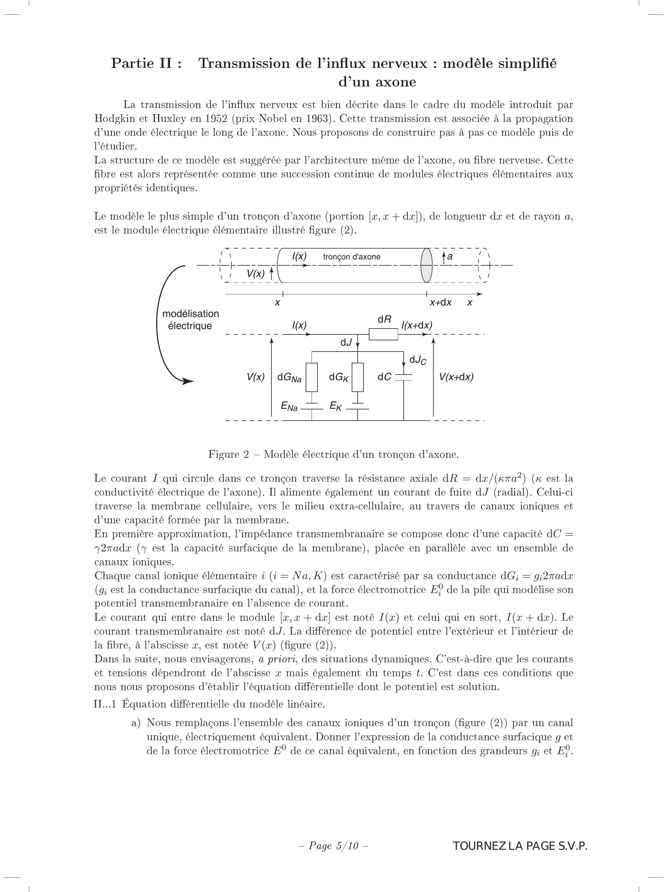 II... 3 Il s'avère donc que le modèle linéaire précédent ne rend pas compte de la propagation de l'influx nerveux le long de l'axone. En considérant certaines spécificités du comportement électrique des canaux ioniques, et notamment du fait que la conductance des canaux à sodium dépend du potentiel auquel elle est soumise, l'équation différentielle vérifiée par le potentiel transmembranaire devient :