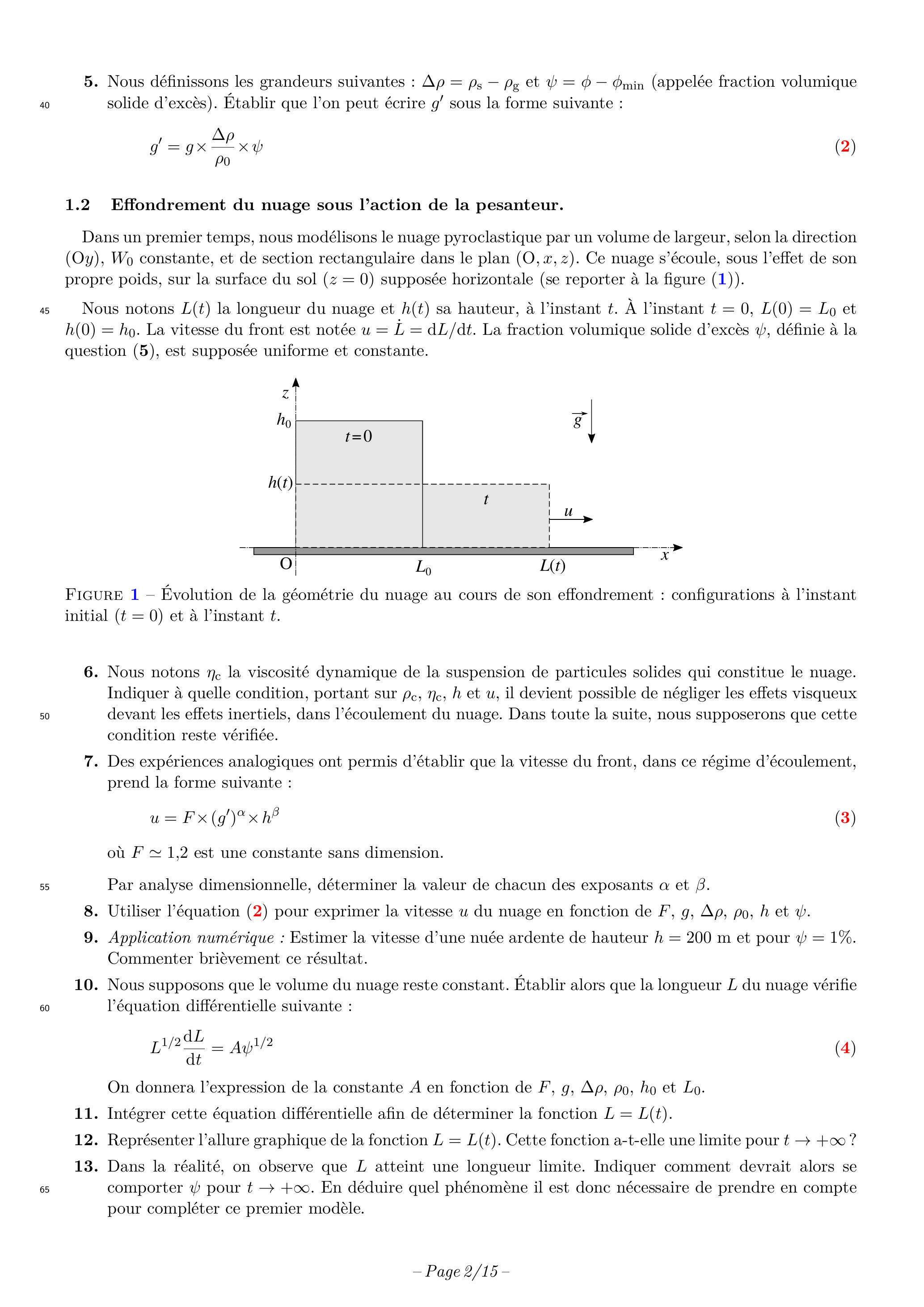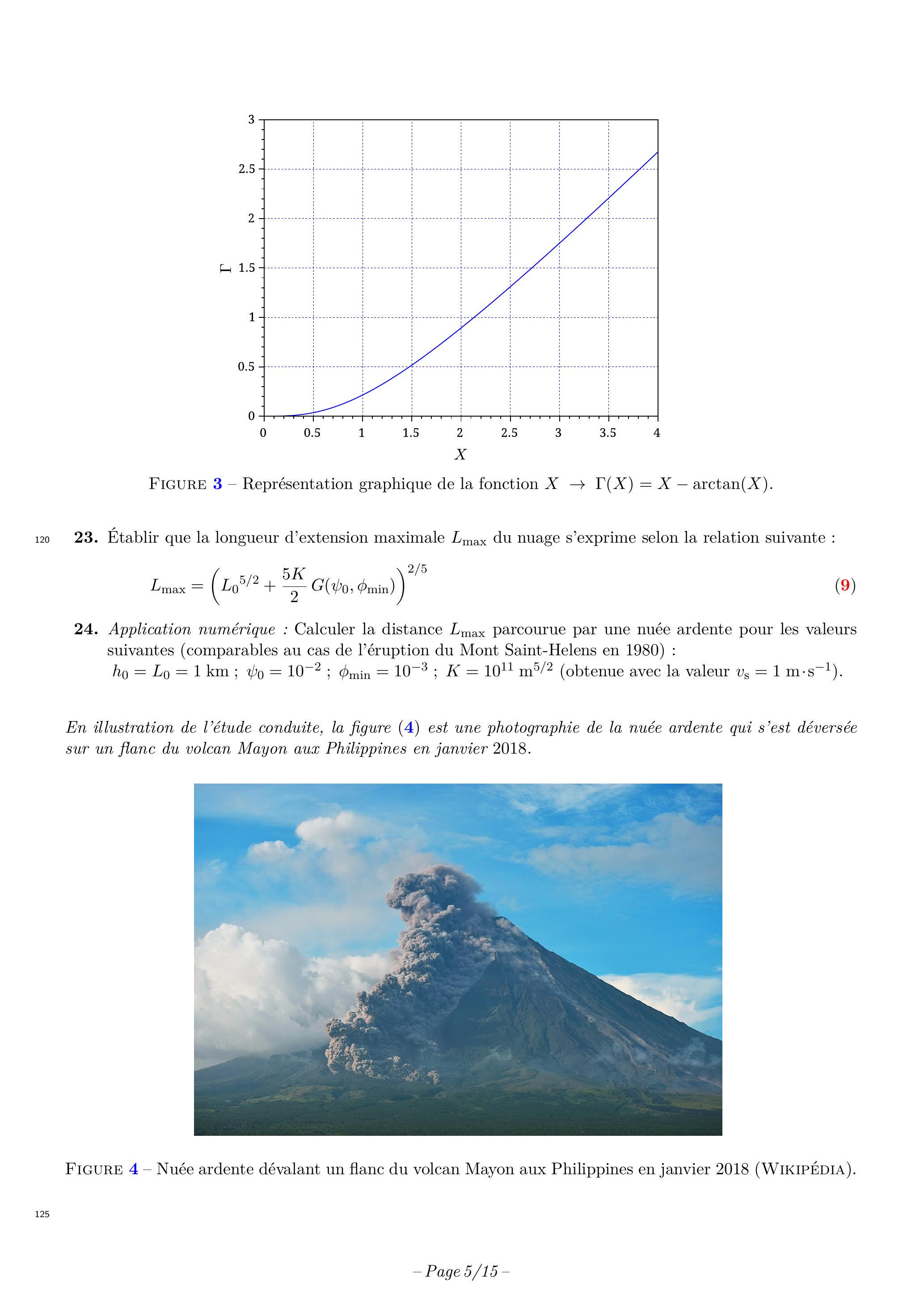 Les éruptions volcaniques sont des risques géologiques majeurs. Ce sujet en étudie deux aspects. Le premier problème s'intéresse à la modélisation physique d'une nuée ardente. Le second problème présente une méthode de prévision des éruptions volcaniques par imagerie satellitaire. Les deux problèmes sont indépendants. Un formulaire trigonométrique est fourni en annexe, en fin d'énoncé.