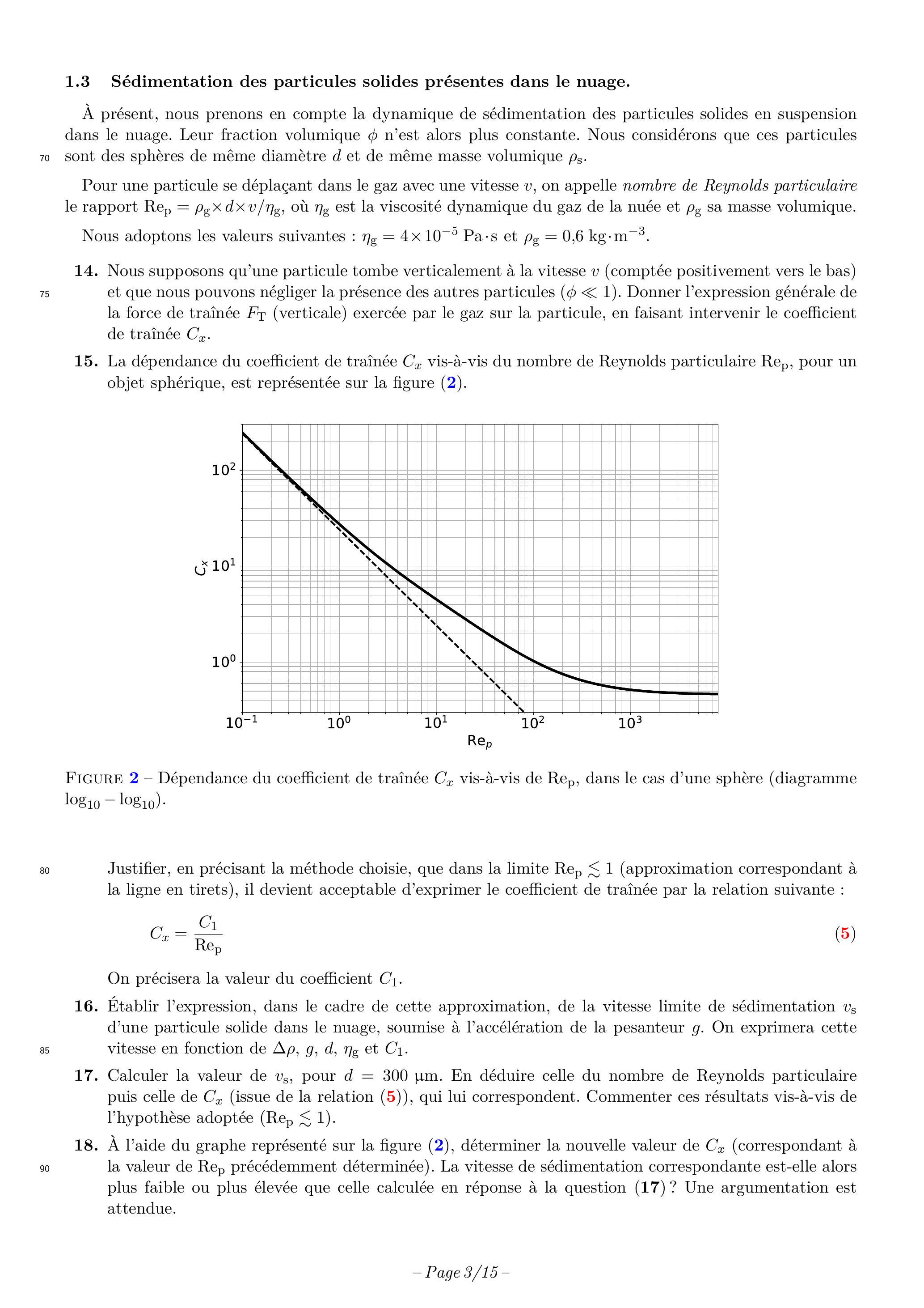 16. Établir l'expression, dans le cadre de cette approximation, de la vitesse limite de sédimentation d'une particule solide dans le nuage, soumise à l'accélération de la pesanteur . On exprimera cette vitesse en fonction de et .
