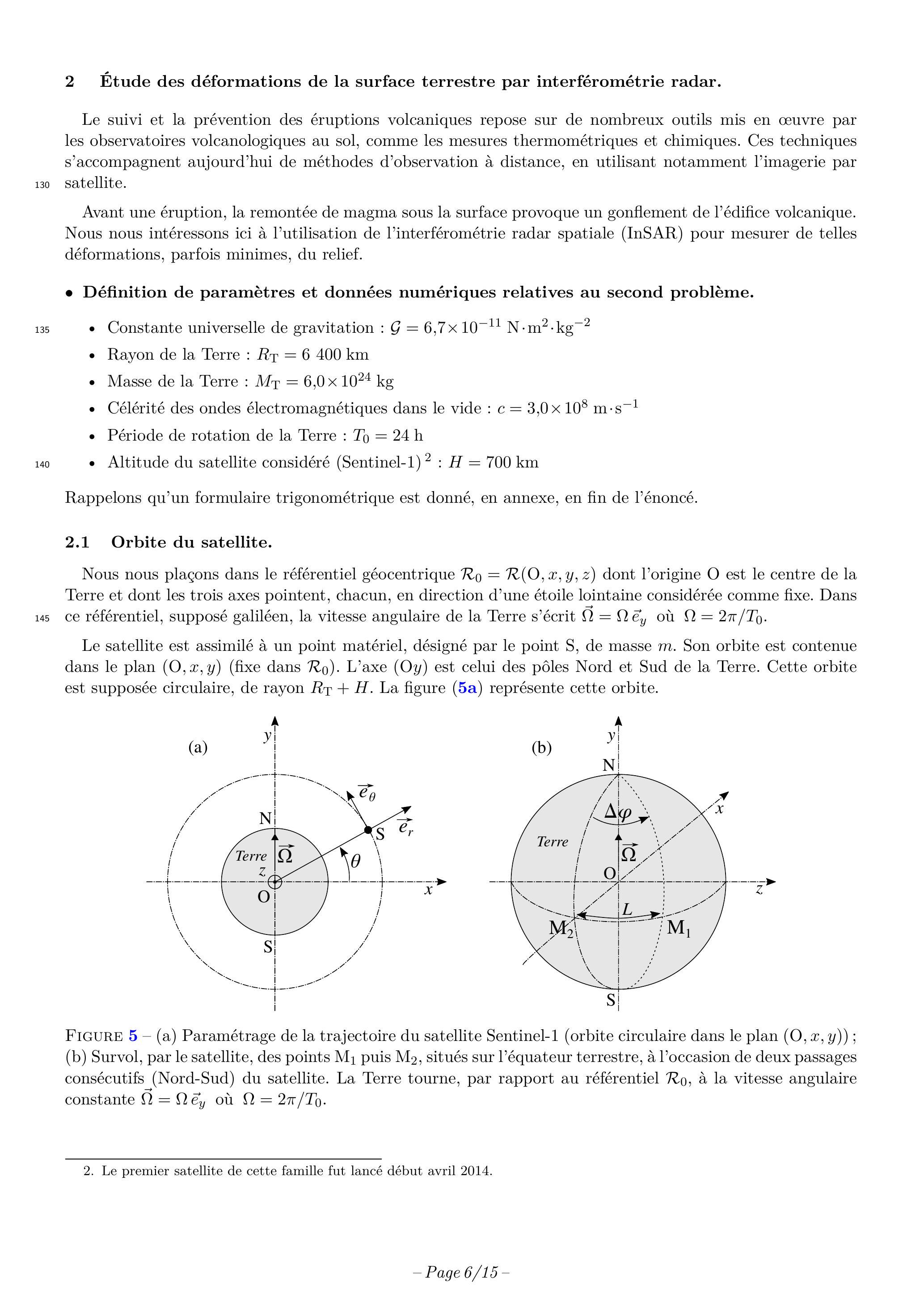 Le satellite relève des images radar de la surface terrestre au cours de la partie descendante, c'est-à-dire du nord au sud, de chacune de ses orbites. Rappelons que les orbites du satellite se situent dans le plan ( ), fixe dans le référentiel , alors que la Terre est animée, par rapport à ce référentiel, de la vitesse angulaire .