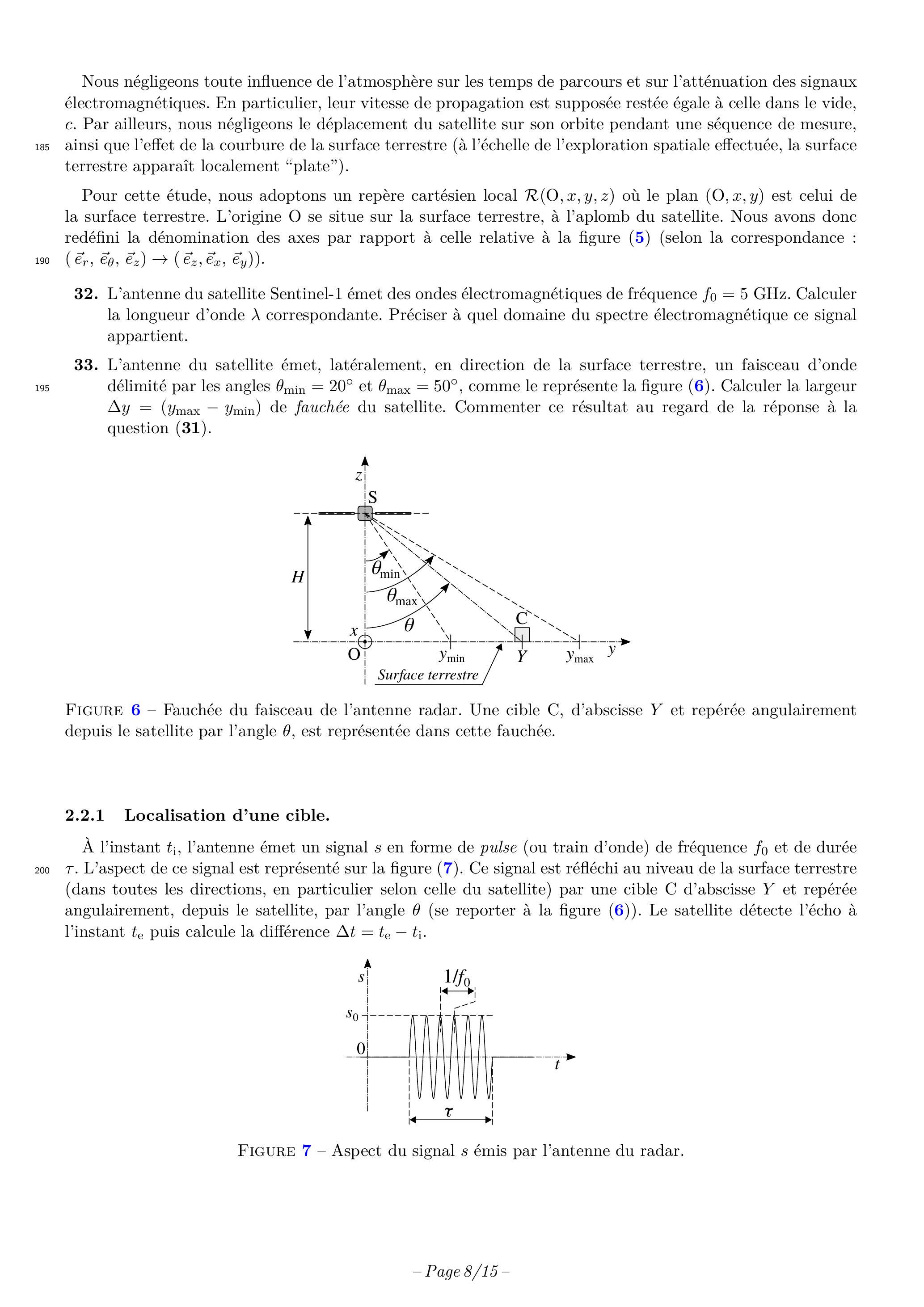 Relier l'intervalle de temps mesuré à l'angle , l'altitude du satellite et la célérité . Relier également l'abscisse de la cible à et .