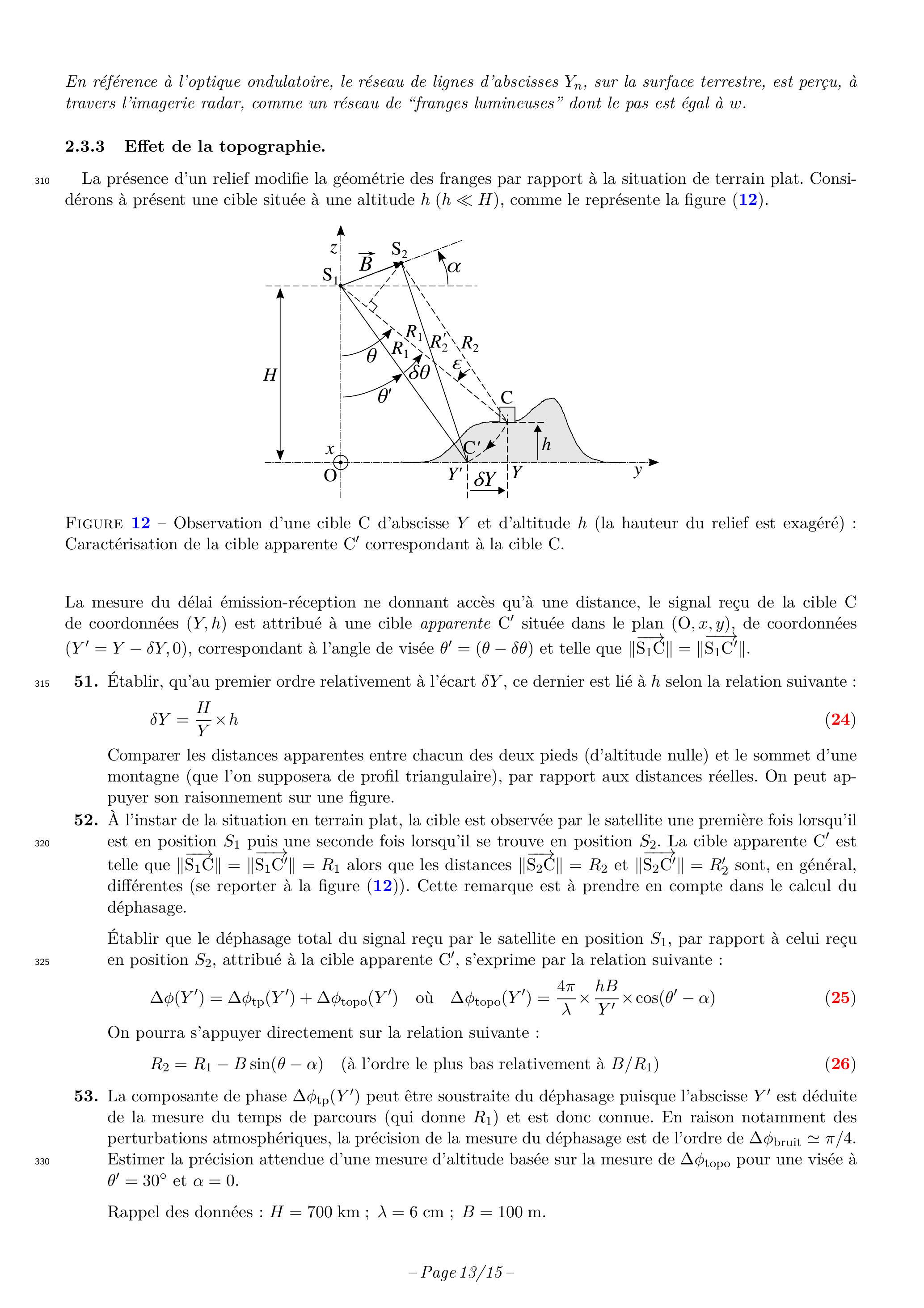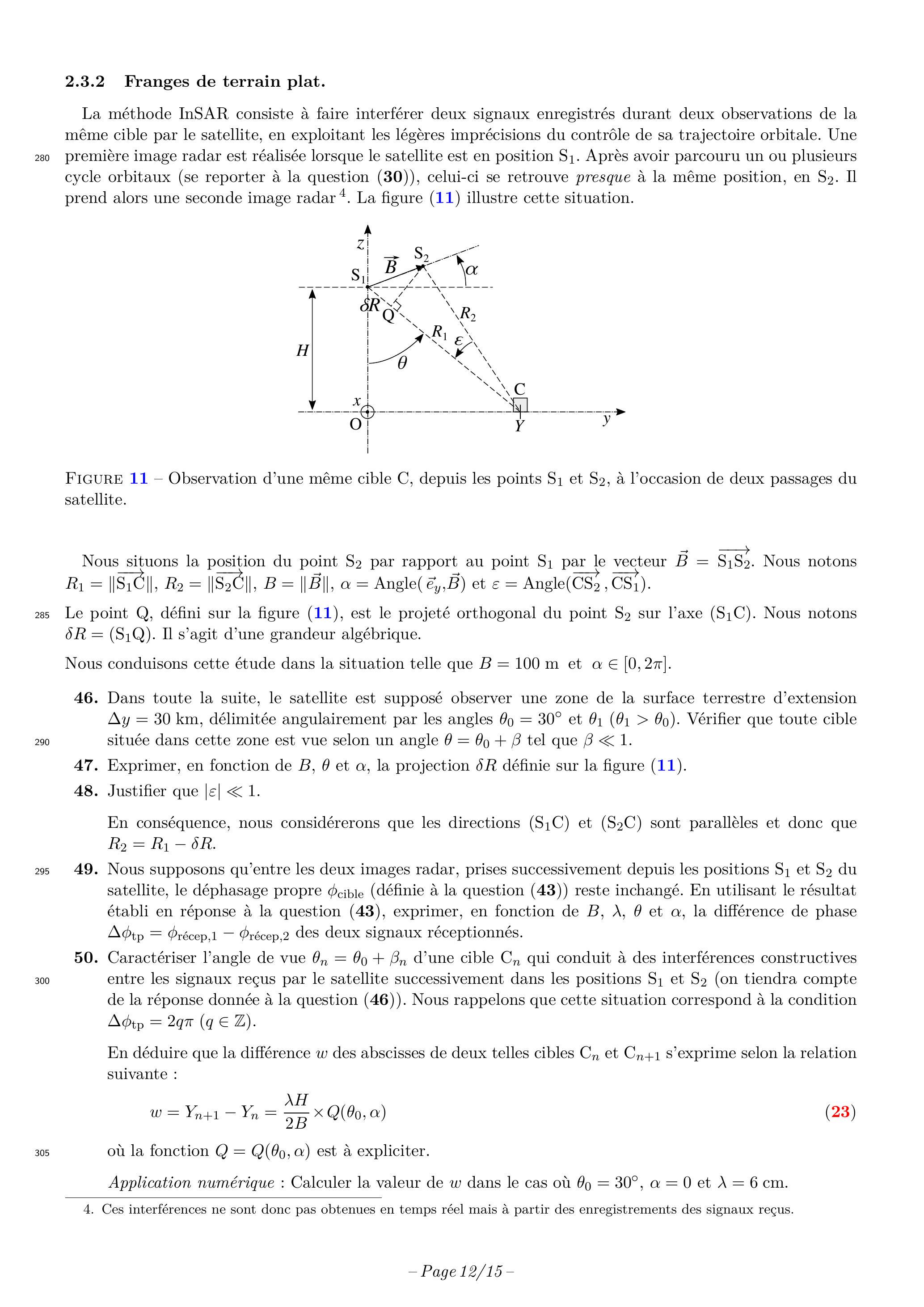 49. Nous supposons qu'entre les deux images radar, prises successivement depuis les positions et du satellite, le déphasage propre (définie à la question (43)) reste inchangé. En utilisant le résultat établi en réponse à la question (43), exprimer, en fonction de et , la différence de phase éé des deux signaux réceptionnés.