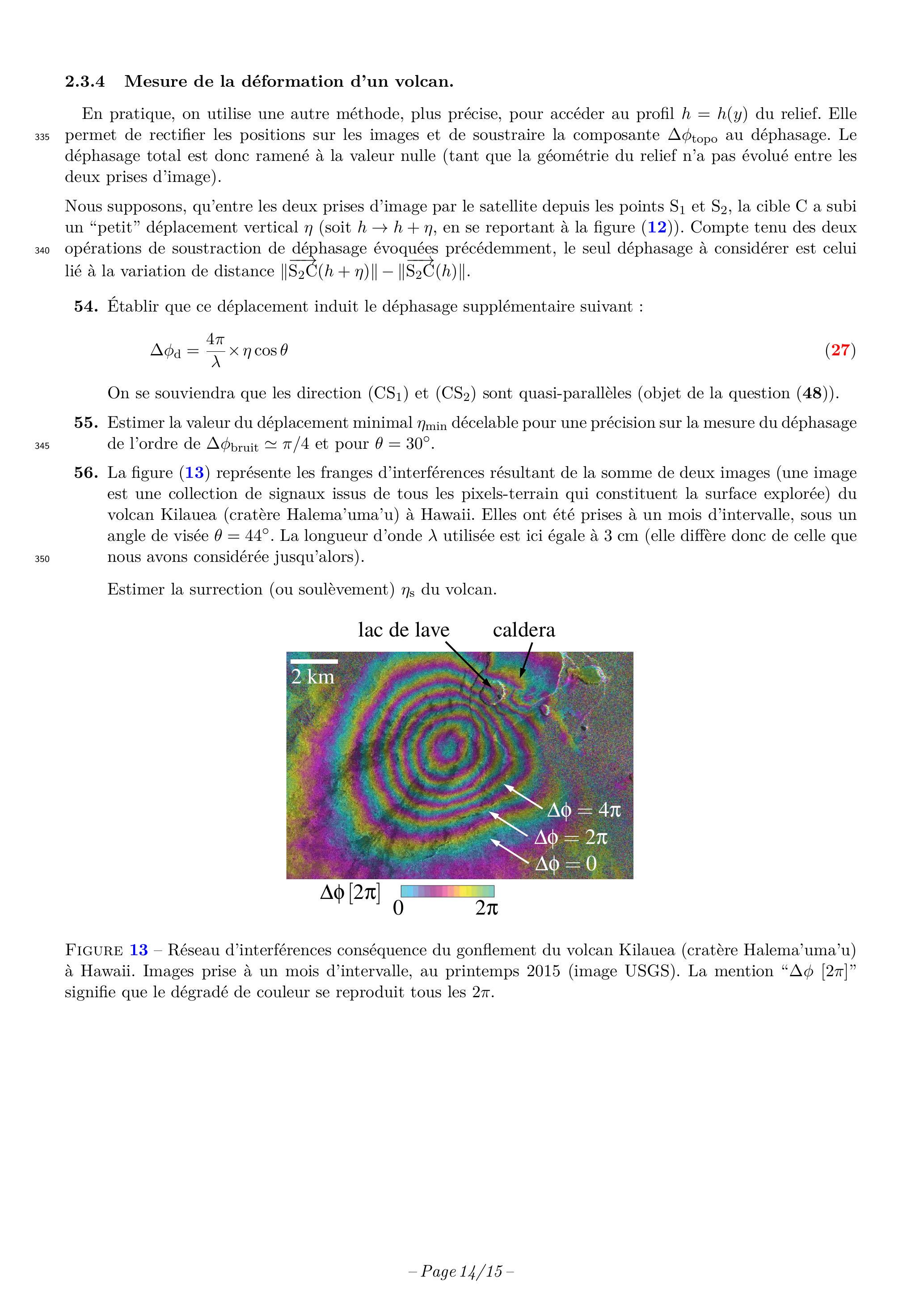 56. La figure (13) représente les franges d'interférences résultant de la somme de deux images (une image est une collection de signaux issus de tous les pixels-terrain qui constituent la surface explorée) du volcan Kilauea (cratère Halema'uma'u) à Hawaii. Elles ont été prises à un mois d'intervalle, sous un angle de visée . La longueur d'onde utilisée est ici égale à 3 cm (elle diffère donc de celle que nous avons considérée jusqu'alors).