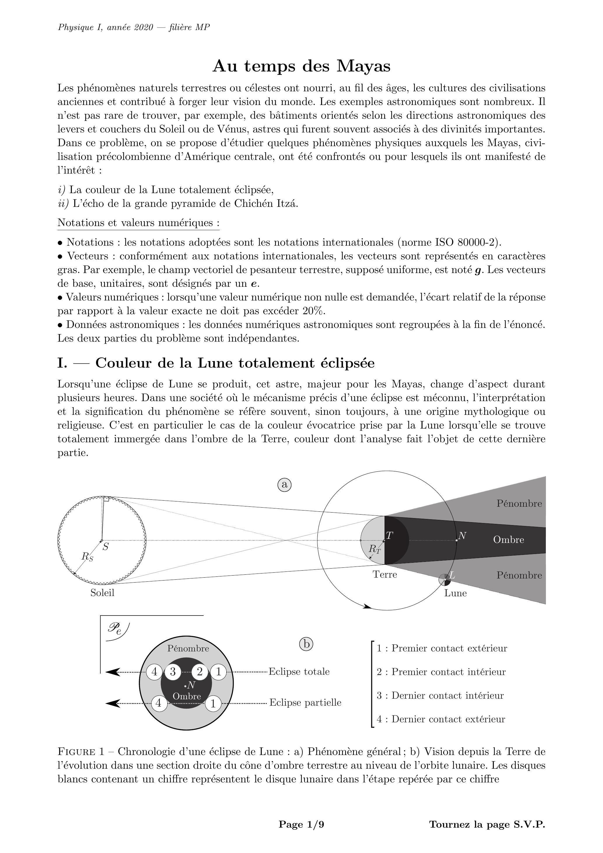 Les phénomènes naturels terrestres ou célestes ont nourri, au fil des âges, les cultures des civilisations anciennes et contribué à forger leur vision du monde. Les exemples astronomiques sont nombreux. Il n'est pas rare de trouver, par exemple, des bâtiments orientés selon les directions astronomiques des levers et couchers du Soleil ou de Vénus, astres qui furent souvent associés à des divinités importantes. Dans ce problème, on se propose d'étudier quelques phénomènes physiques auxquels les Mayas, civilisation précolombienne d'Amérique centrale, ont été confrontés ou pour lesquels ils ont manifesté de l'intérêt :