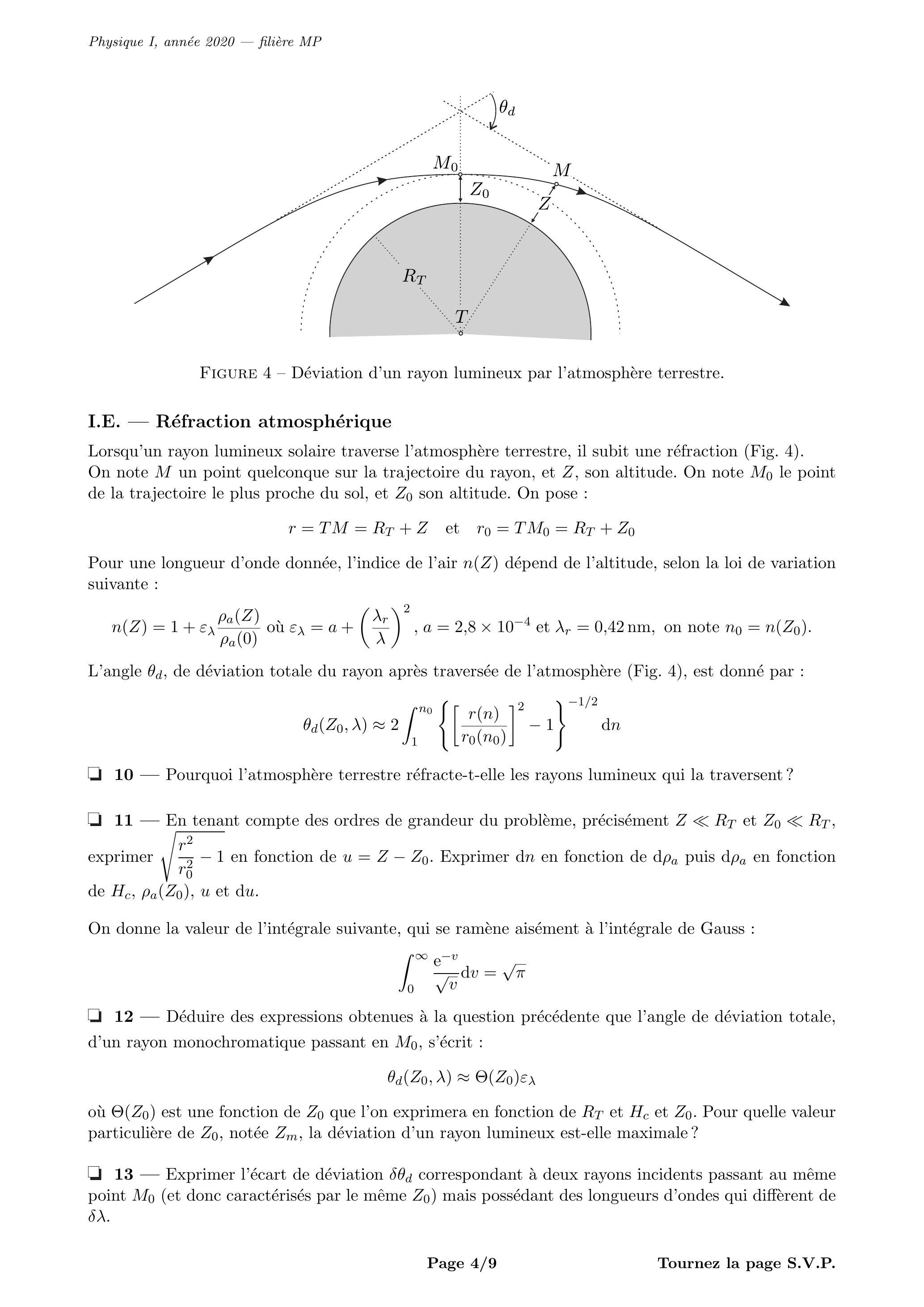 10- Pourquoi l'atmosphère terrestre réfracte-t-elle les rayons lumineux qui la traversent? - En tenant compte des ordres de grandeur du problème, précisément et , exprimer en fonction de . Exprimer en fonction de puis en fonction de et .