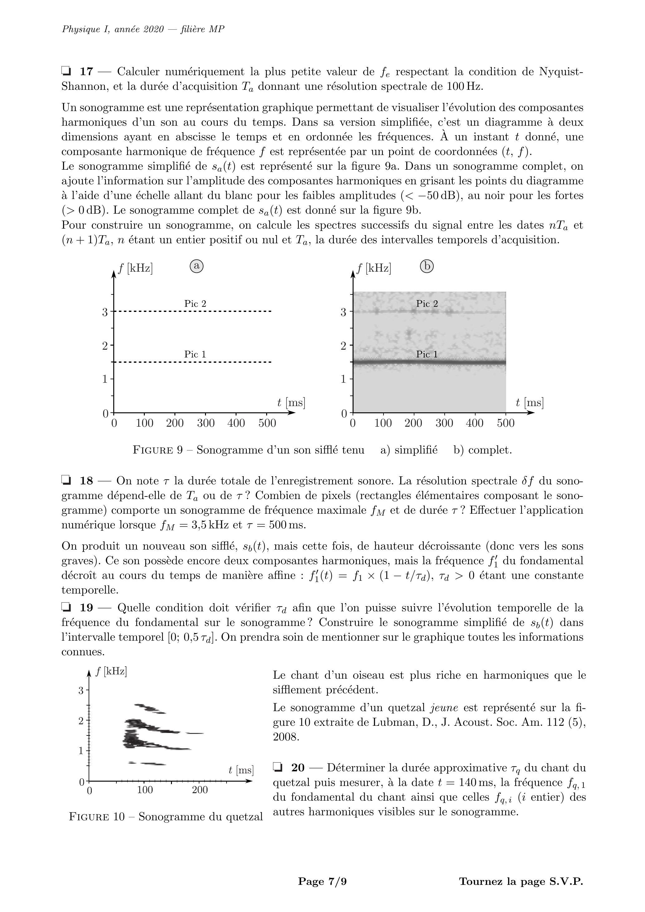 19 - Quelle condition doit vérifier afin que l'on puisse suivre l'évolution temporelle de la fréquence du fondamental sur le sonogramme? Construire le sonogramme simplifié de dans l'intervalle temporel . On prendra soin de mentionner sur le graphique toutes les informations connues.