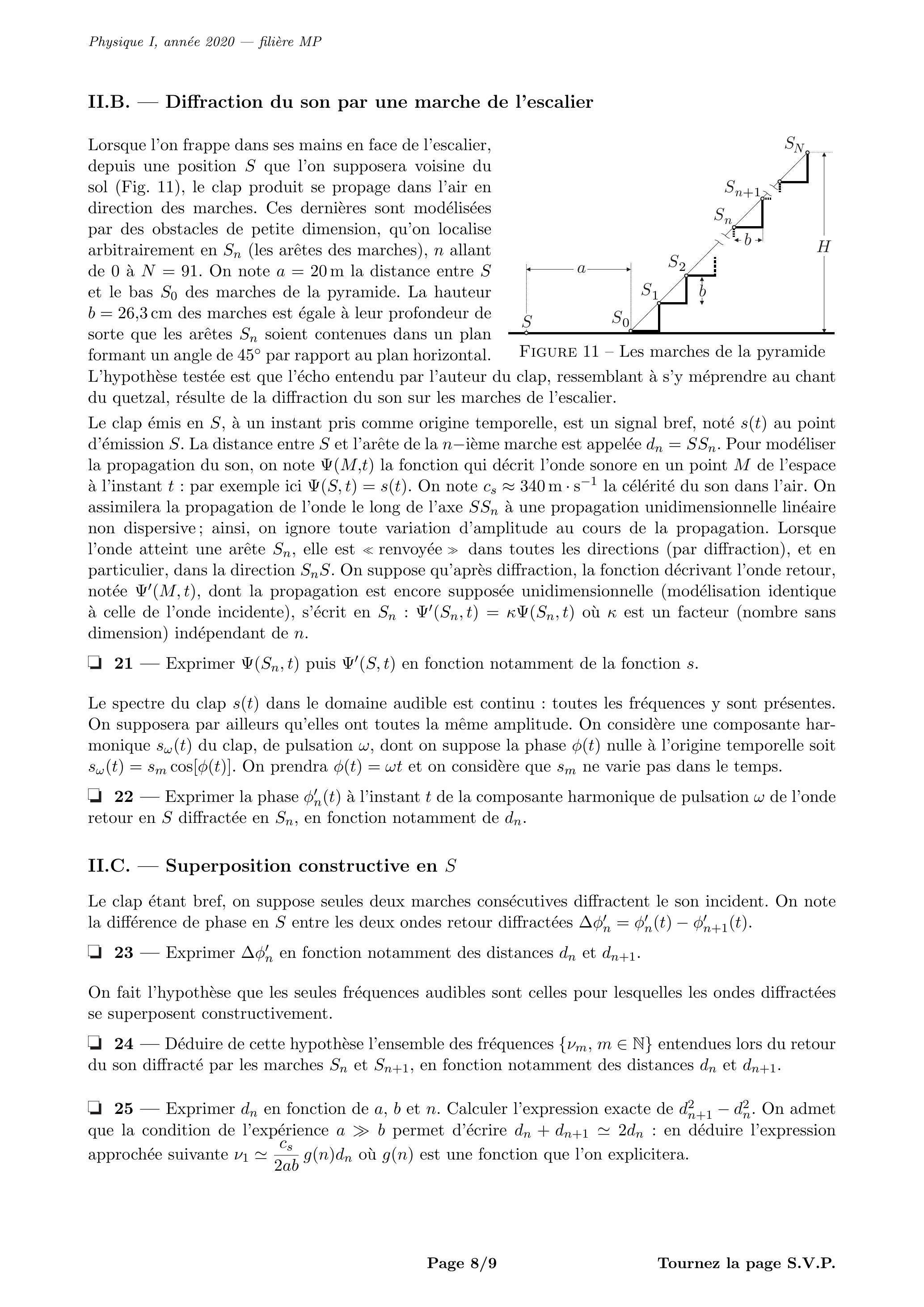 24 - Déduire de cette hypothèse l'ensemble des fréquences entendues lors du retour du son diffracté par les marches et , en fonction notamment des distances et . - Exprimer en fonction de et . Calculer l'expression exacte de . On admet que la condition de l'expérience permet d'écrire : en déduire l'expression approchée suivante où est une fonction que l'on explicitera.