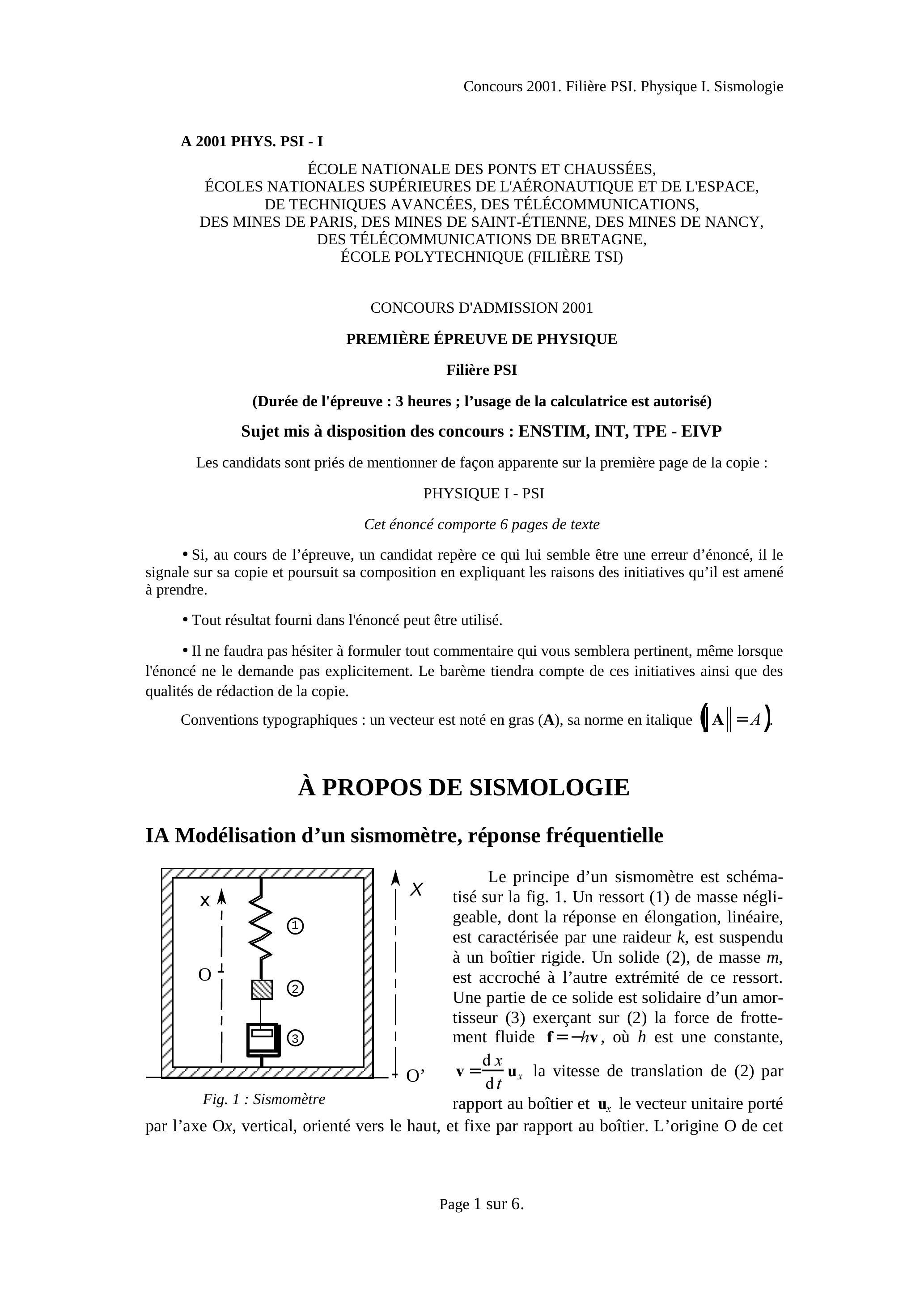 CONCOURS D'ADMISSION 2001 PREMIÈRE ÉPREUVE DE PHYSIQUE Filière PSI