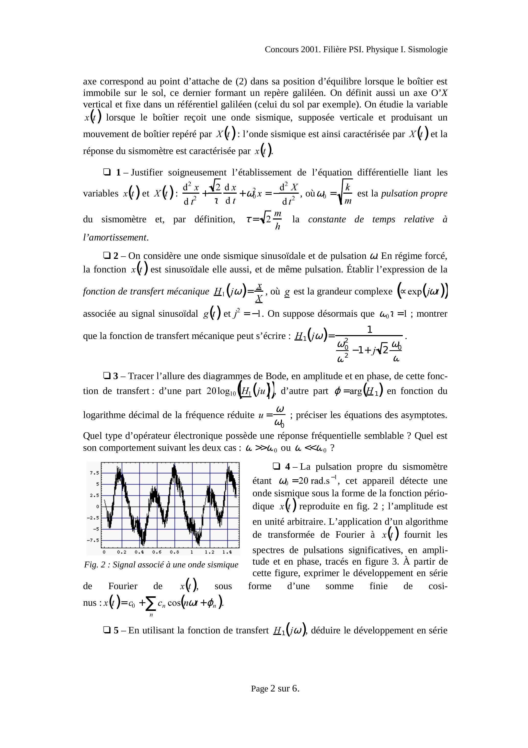 axe correspond au point d'attache de (2) dans sa position d'équilibre lorsque le boîtier est immobile sur le sol, ce dernier formant un repère galiléen. On définit aussi un axe vertical et fixe dans un référentiel galiléen (celui du sol par exemple). On étudie la variable lorsque le boîtier reçoit une onde sismique, supposée verticale et produisant un mouvement de boîtier repéré par : l’onde sismique est ainsi caractérisée par et la réponse du sismomètre est caractérisée par .