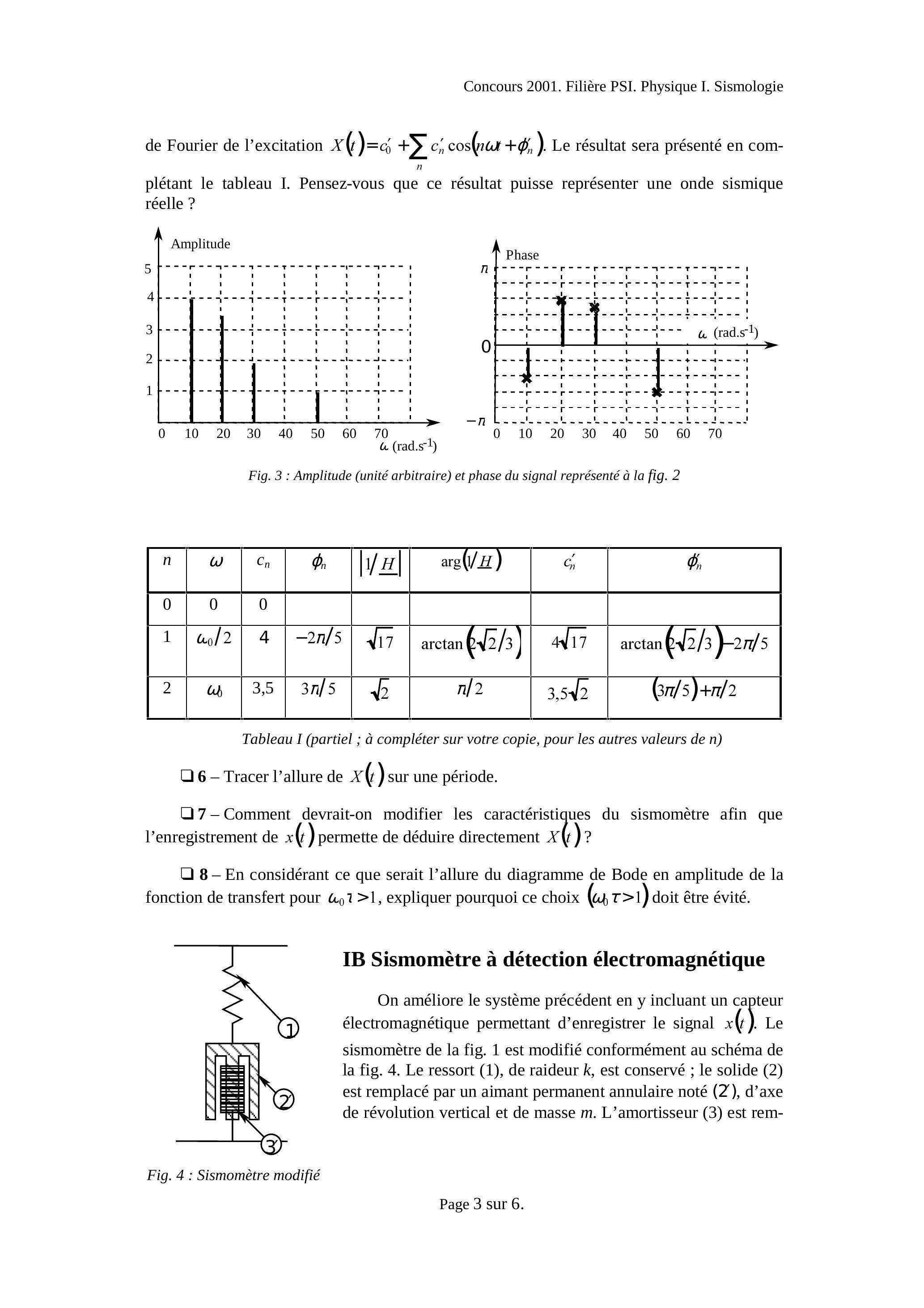4-La pulsation propre du sismomètre étant , cet appareil détecte une onde sismique sous la forme de la fonction périodique reproduite en fig. 2 ; l'amplitude est en unité arbitraire. L'application d'un algorithme de transformée de Fourier à fournit les spectres de pulsations significatives, en amplitude et en phase, tracés en figure 3. À partir de cette figure, exprimer le développement en série de Fourier de , sous forme d'une somme finie de cosinus : . - En utilisant la fonction de transfert , déduire le développement en série